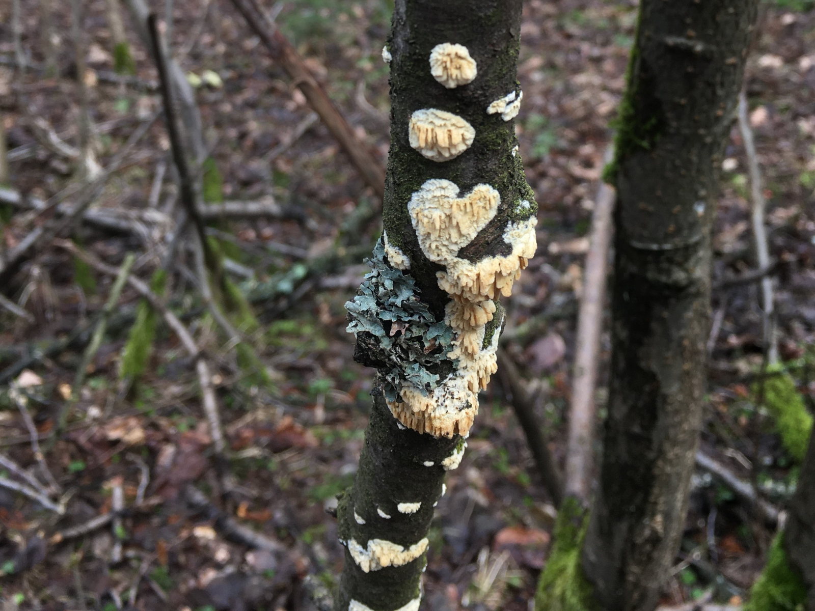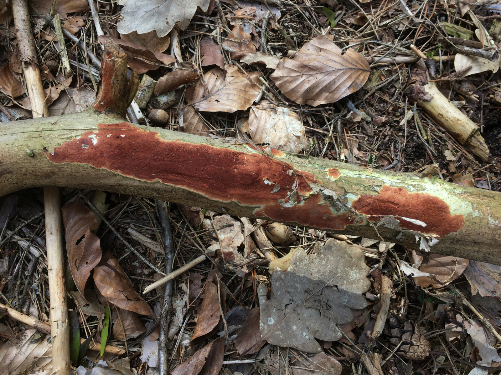 3) im Auwald an Kirsche (Ast sieht aus als würde er stehen, hängt aber in der Luft) , breite flache Zähnchen, bräunchlich verfärbend, in ovalen Arealen auftretend, resupinat.