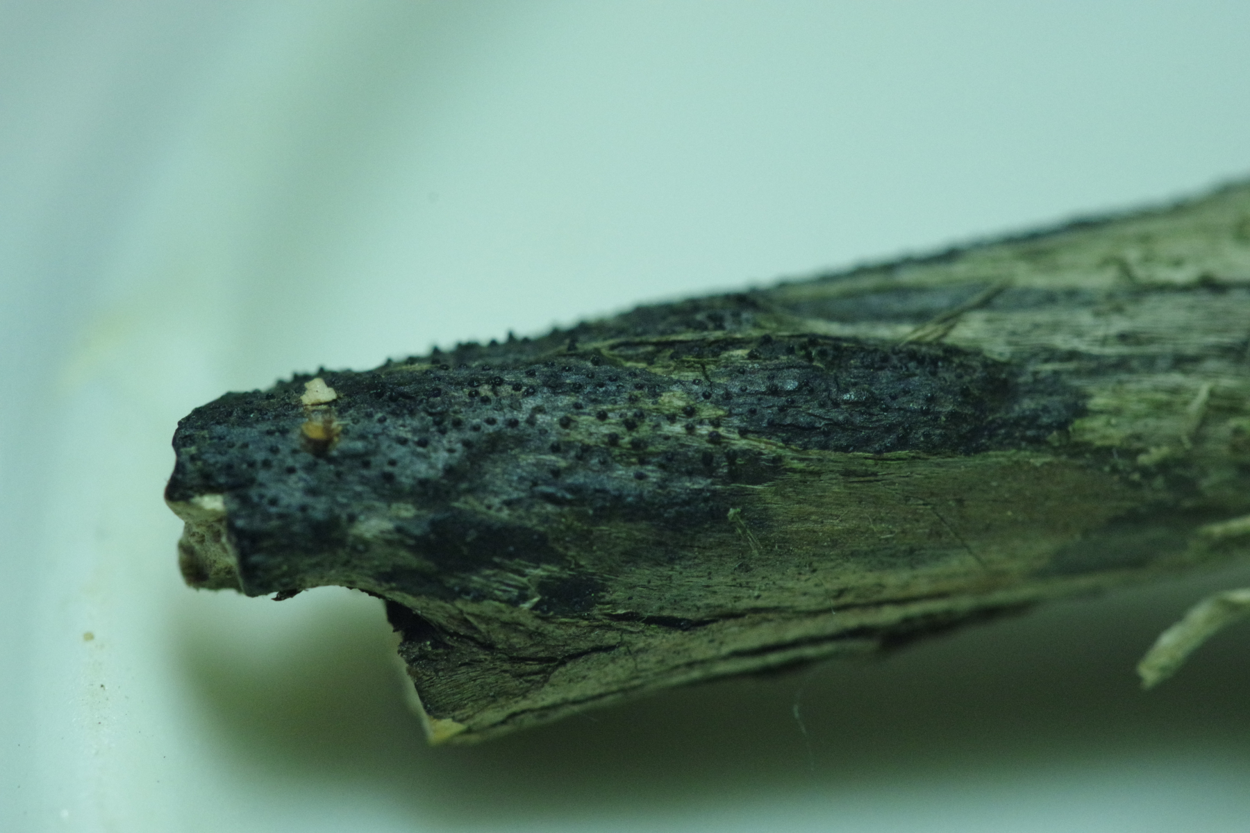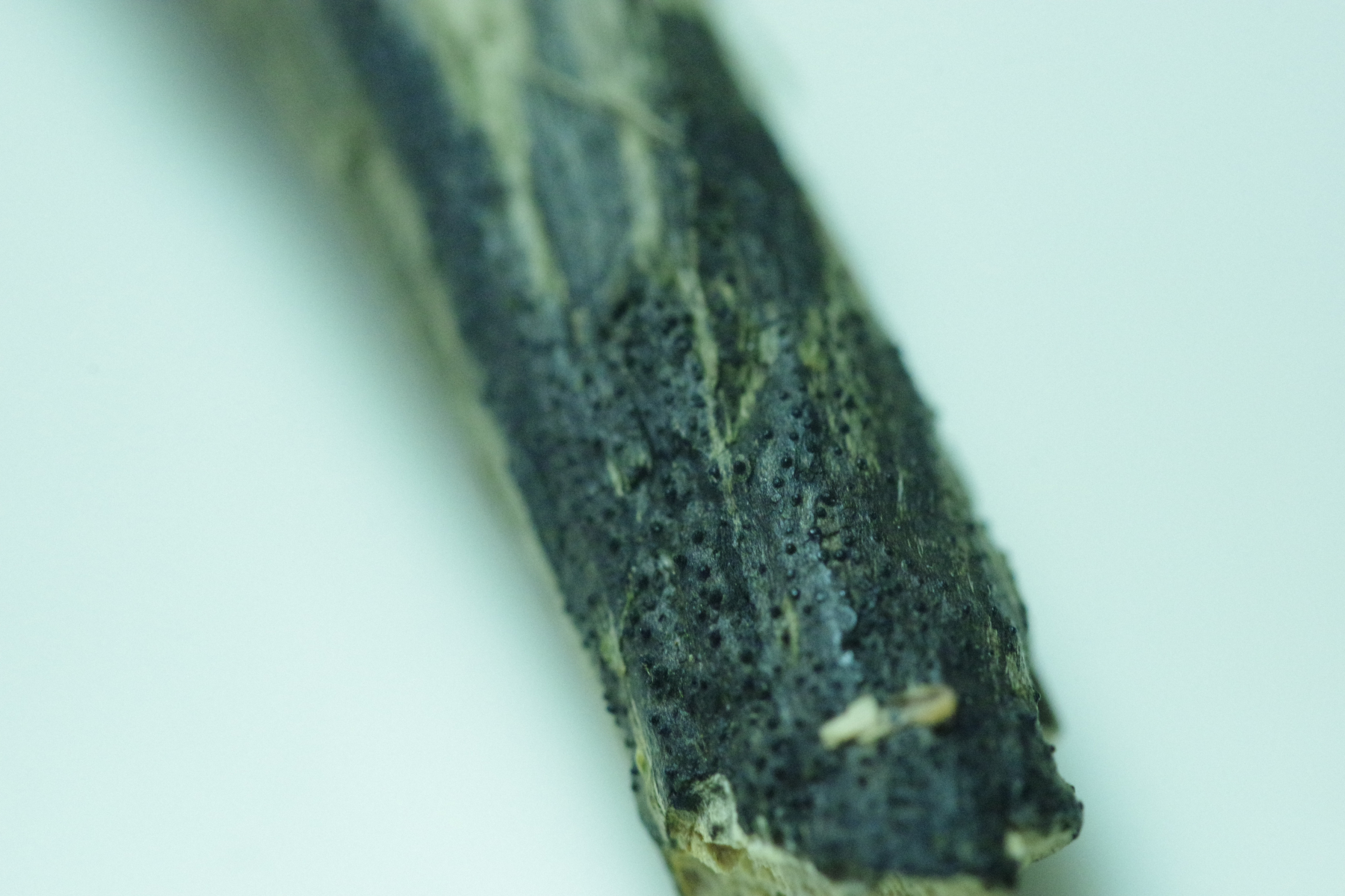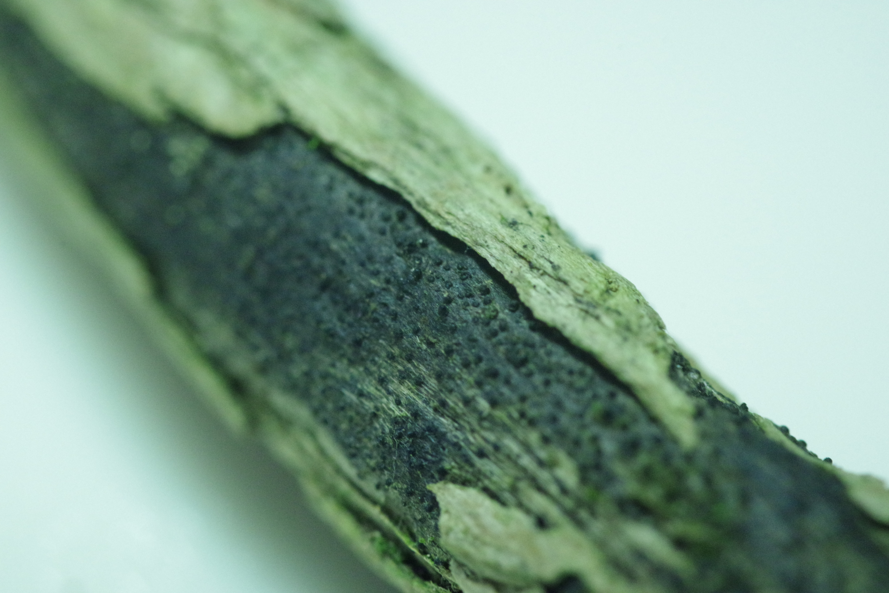 an Heckenkirsche (Lonicera xylosteum) knapp über dem Boden habe ich diesen schwarzen Belag gefunden, ich schließe nicht aus, dass der charakteristisch genug sein könnte, um zusammen mit dem Substrat eine Bestimmung/Eingrenzung zu erlauben. Das Stöckchen hat einen Durchmesser von etwa 7 mm.