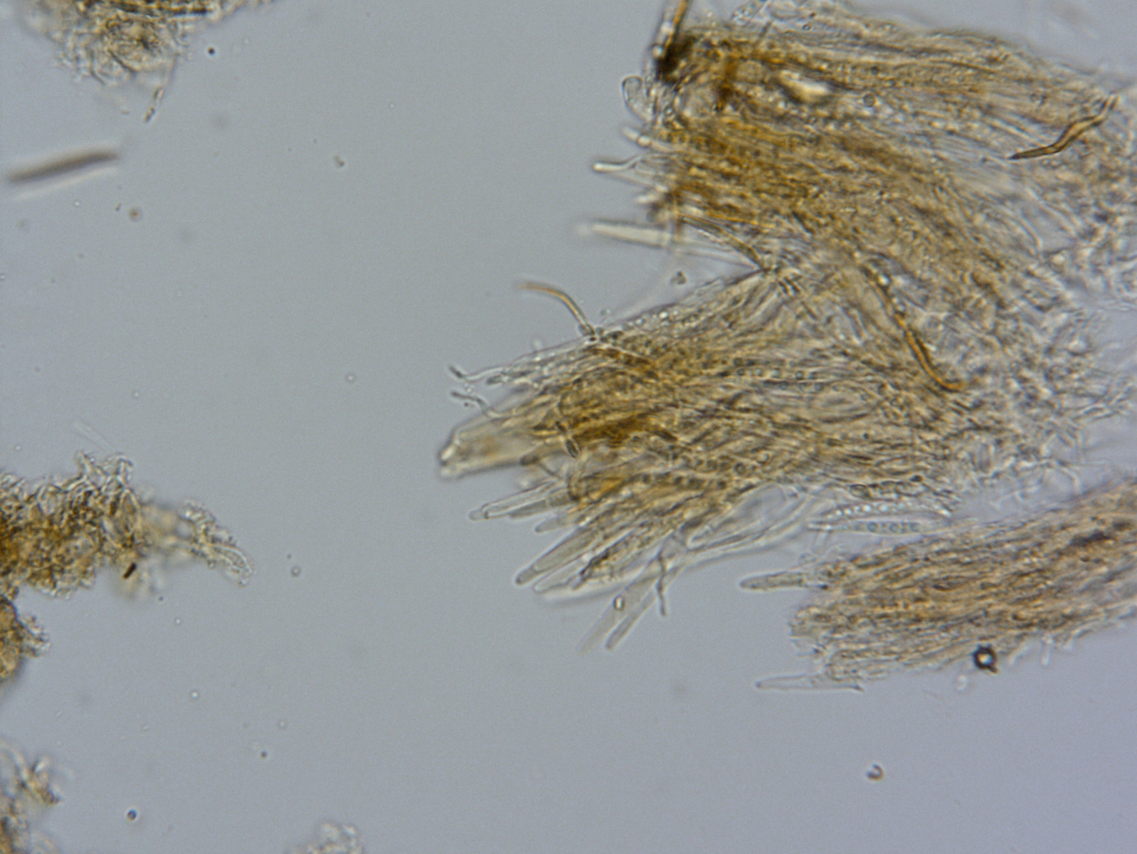 das Becherchen oben ist eine überalterte, daher stark entfärbte Trichopeziza. Wegen der Sporengröße, dem vielen Ölinhalt der Sporen und der Paraphysen wäre ich hier bei T. sulphurea. Sollte dann keine Haken haben. Du kannst ja mal hier mit Zottos Archiv vergleichen, da bekommt man einen annähernden Überblick, was es da so gibt.