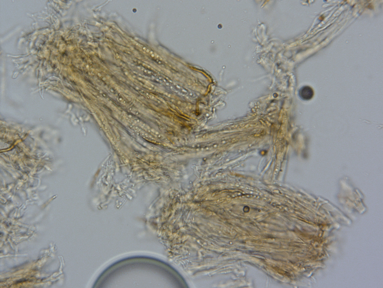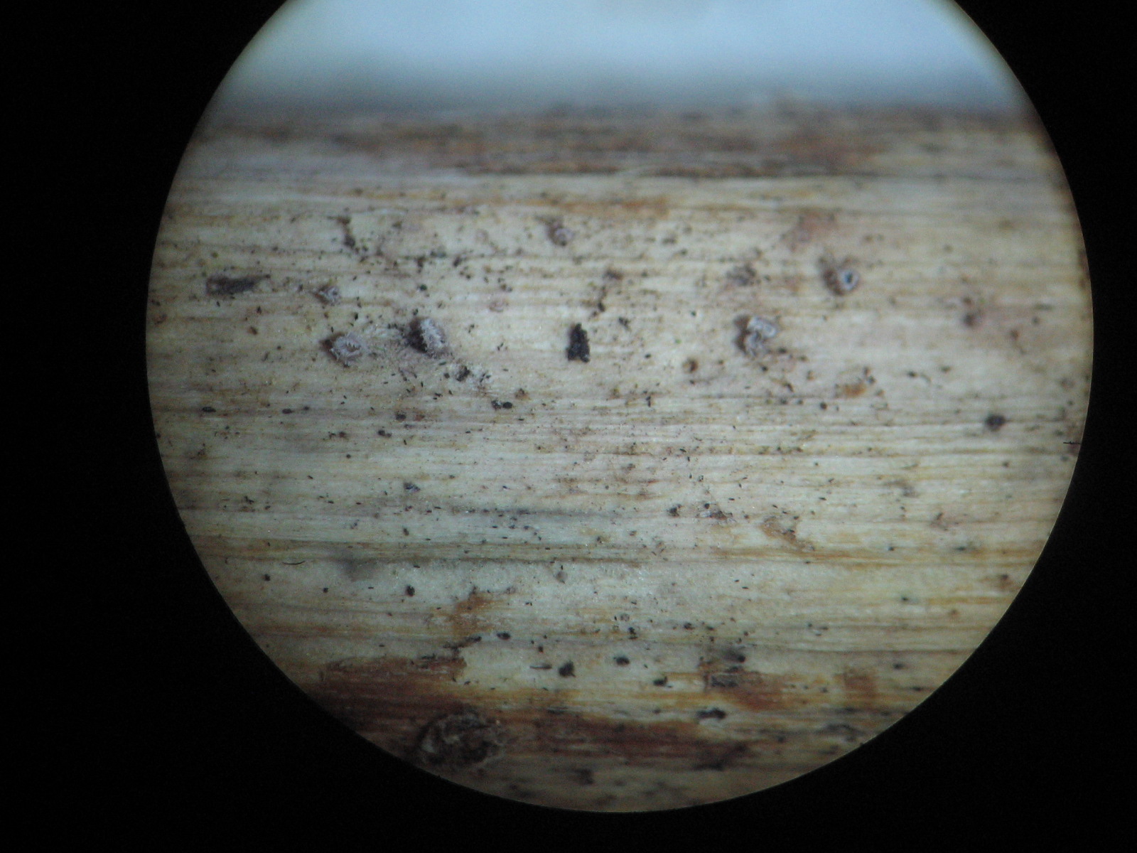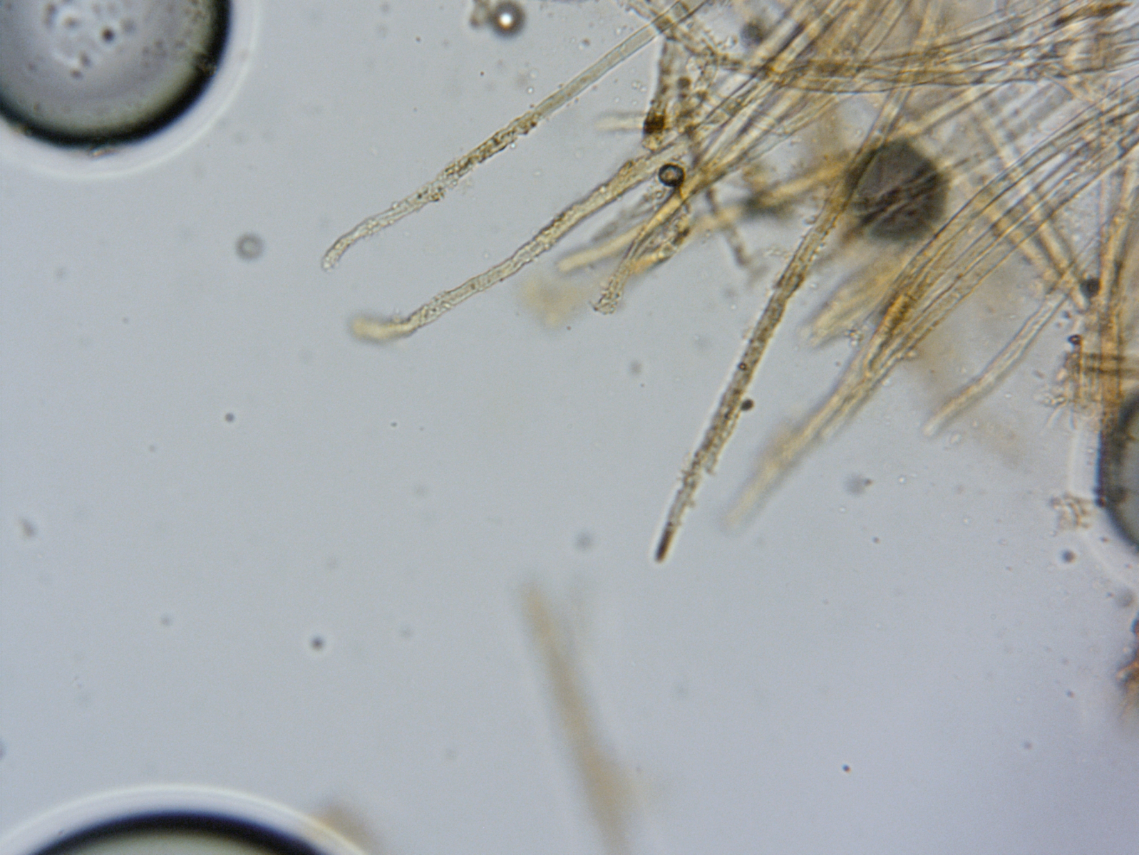 Die Dinger sind ca. 0,5 mm im Durchmesser, ungestielt und außen sehr behaart. Makroskopisch könnte man da an Lachnella villosa denken. Mikroskopisch sieht das allerdings ganz anders aus. Die Haare sind unter dem Mikroskop meiner Meinung nach mehr inkrustiniert, als ich auf Beispielbildern im Netz gefunden habe. Die Sporen, die gefunden habe passen überhaupt nicht, sie sind lang und dünn, teilweise gebogen