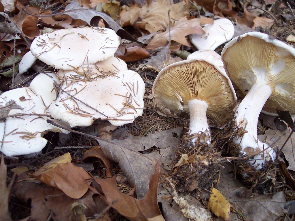Ich hatte bei diesem Pilz erst an den Mehl-Räsling gedacht. Aber die Lamellen scheinen mir zu wenig herablaufend und zu dunkel zu sein. Gegen den Weißen Rasling aber wiederum für den Mehl-Räsling spricht der nicht-glasige Stiel und die filzige Basis. Der Geruch könnte man als mehlig beschreiben, ist aber vielleicht eher würzig-arzneimittelartig, bei intensivem Riechen etwas stechend.