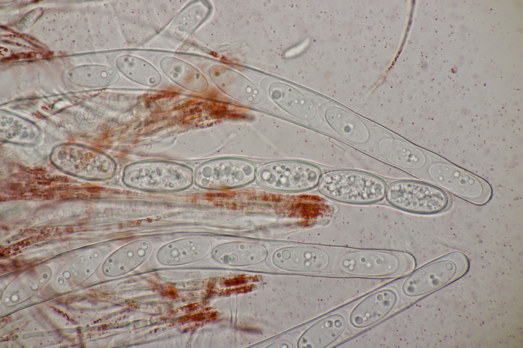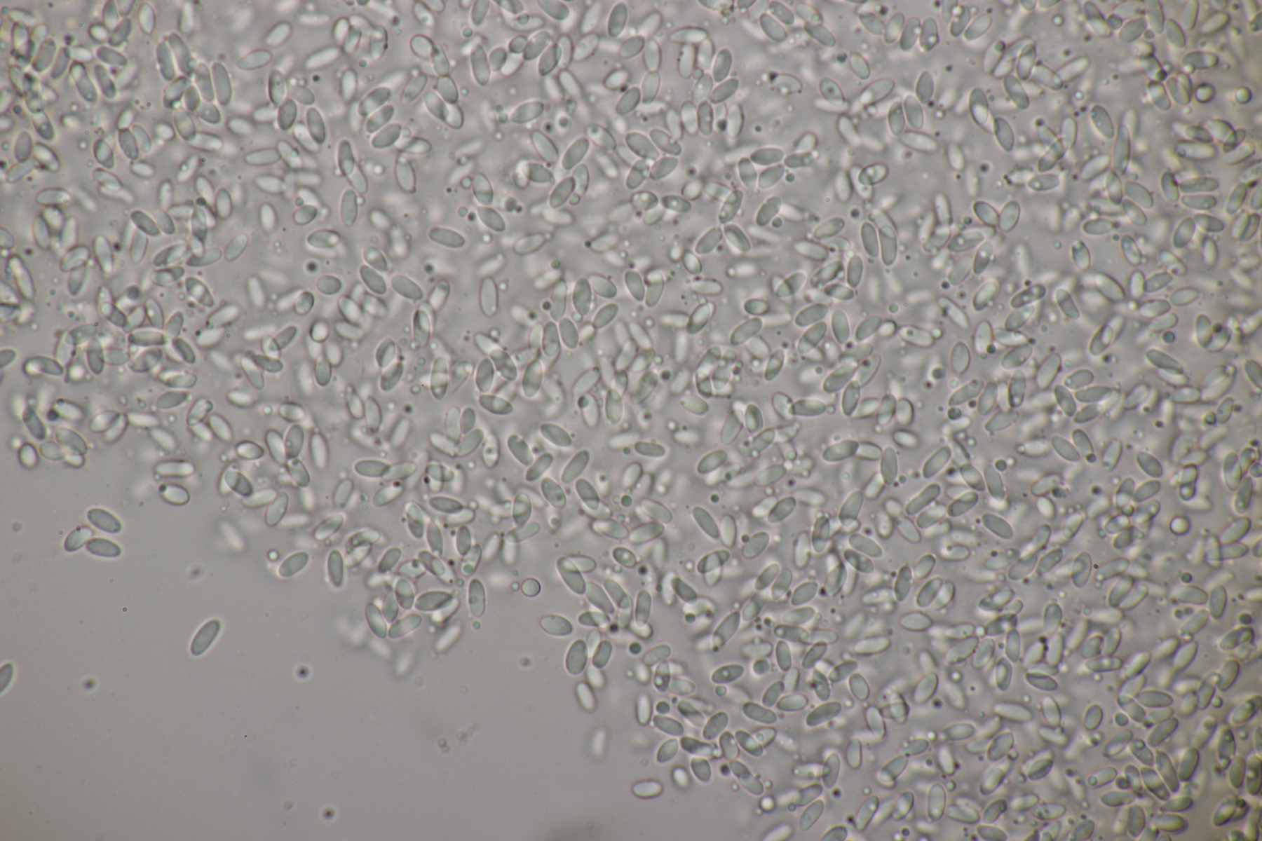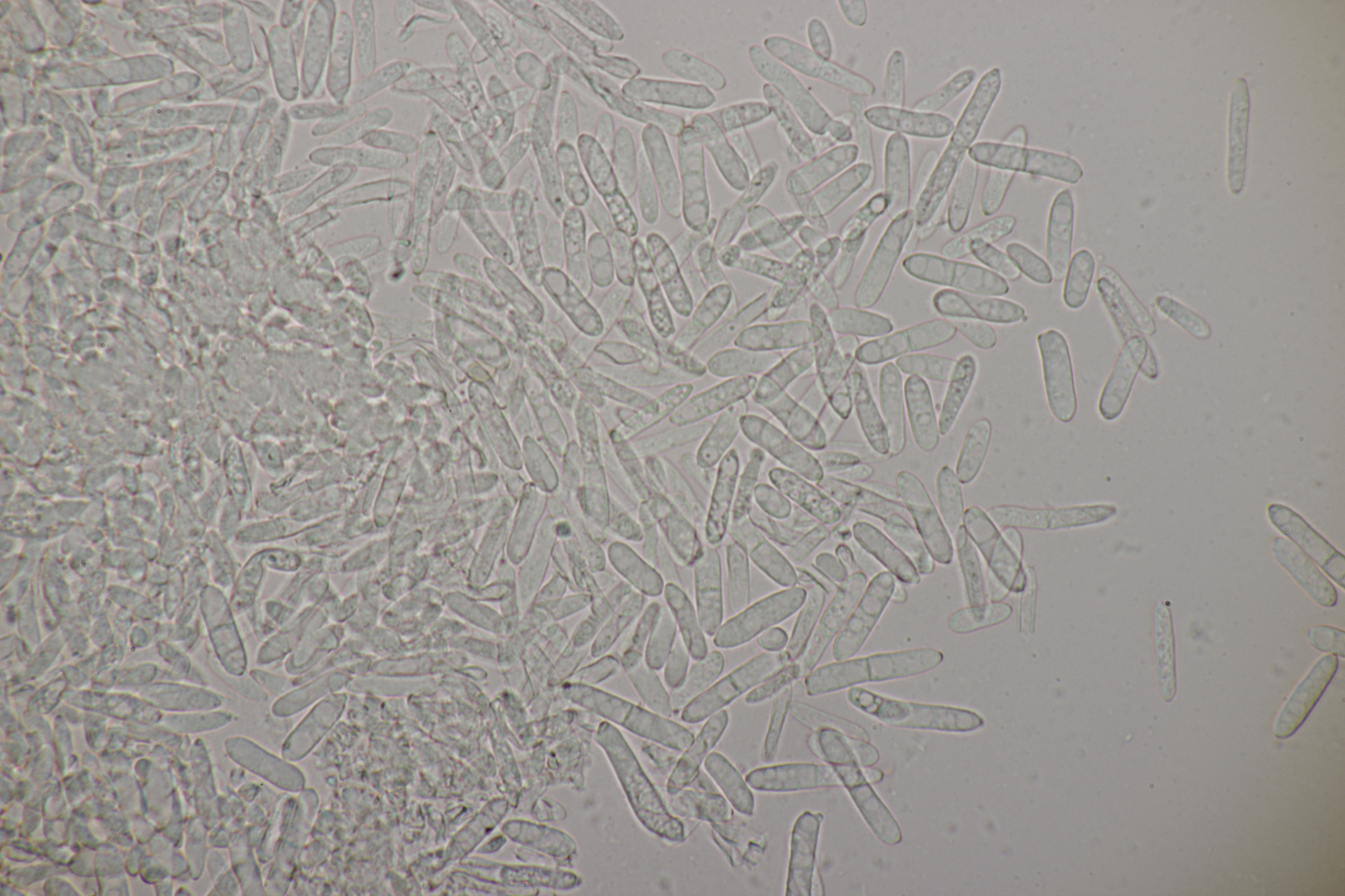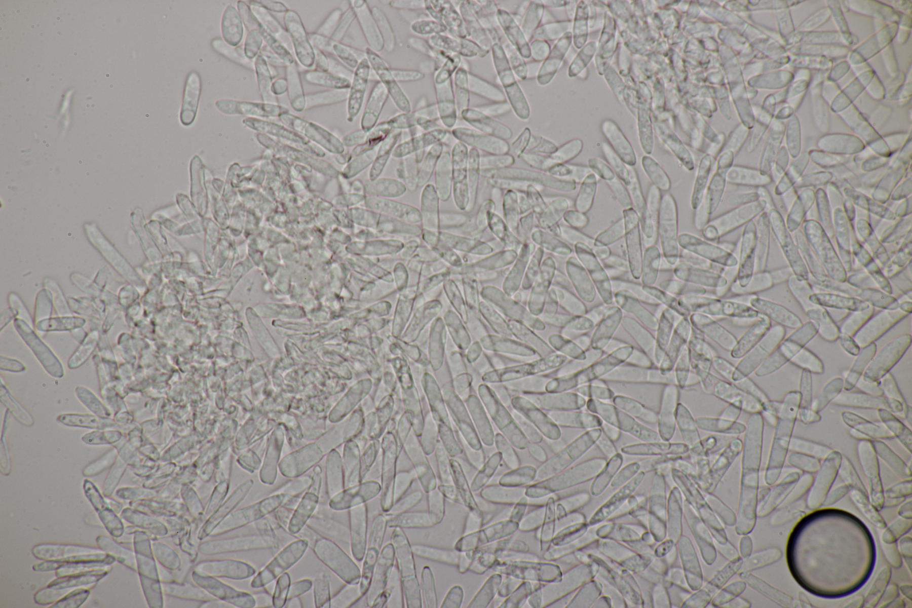 4. Eine Gallertträne ohne Schnallen, mit Sporen von (15.4+-0.6) µm x (6.2+-0.3) µm, Q=2.5+-0.1, (13.9-16.7) µm x (5.9-7.1) µm, Q=2.3-2.7, dreifach septiert und dünnwandig, an Laubholz. Die Fruchtköper sind leicht gestielt, so daß ich hier bei Dacrymyces capitatus lande. thorben96 Ist D. Begerow an Gallerttränen interessiert? Dann würde ich einen Beleg anfertigen