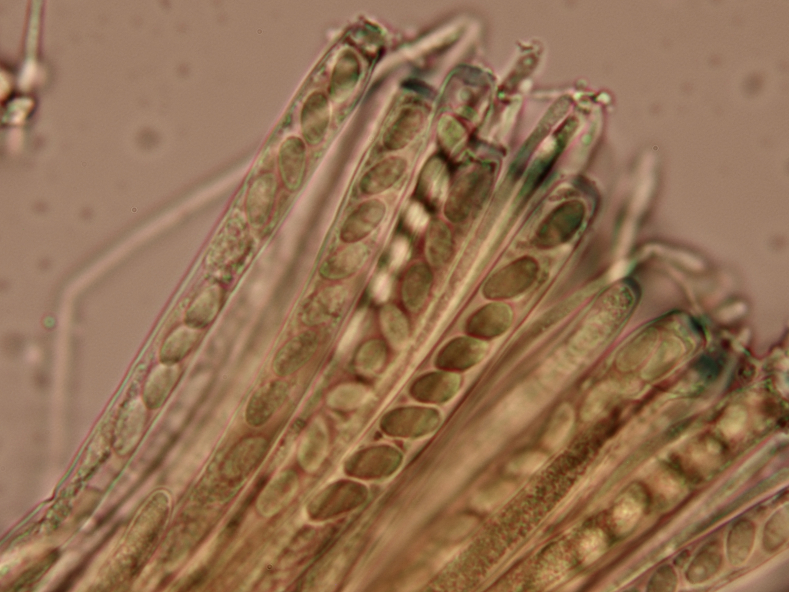 Ich habe einfach vom Fruchtkörper eine sehr dünne Scheibe mit einer Rasierklinge abgeschnitten, das Stück dann in Kongorot gelegt, es danach gewässert, mit Zewa abgetupft und nochmal gewässert, danach mit der Schnittfläche auf den Objektträger gelegt, Wasser und Deckglas drauf, gut angedrückt und unterm Mikroskop sah man dann an der Innenseite des Bechers die Sporenstände und auf der gegenüberliegenden Außenseite die Härchen. Für das Foto hab ich mir dann einfach die eindeutigste Stelle ausgesucht.