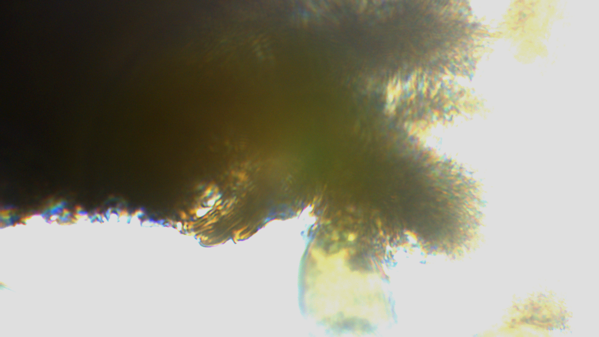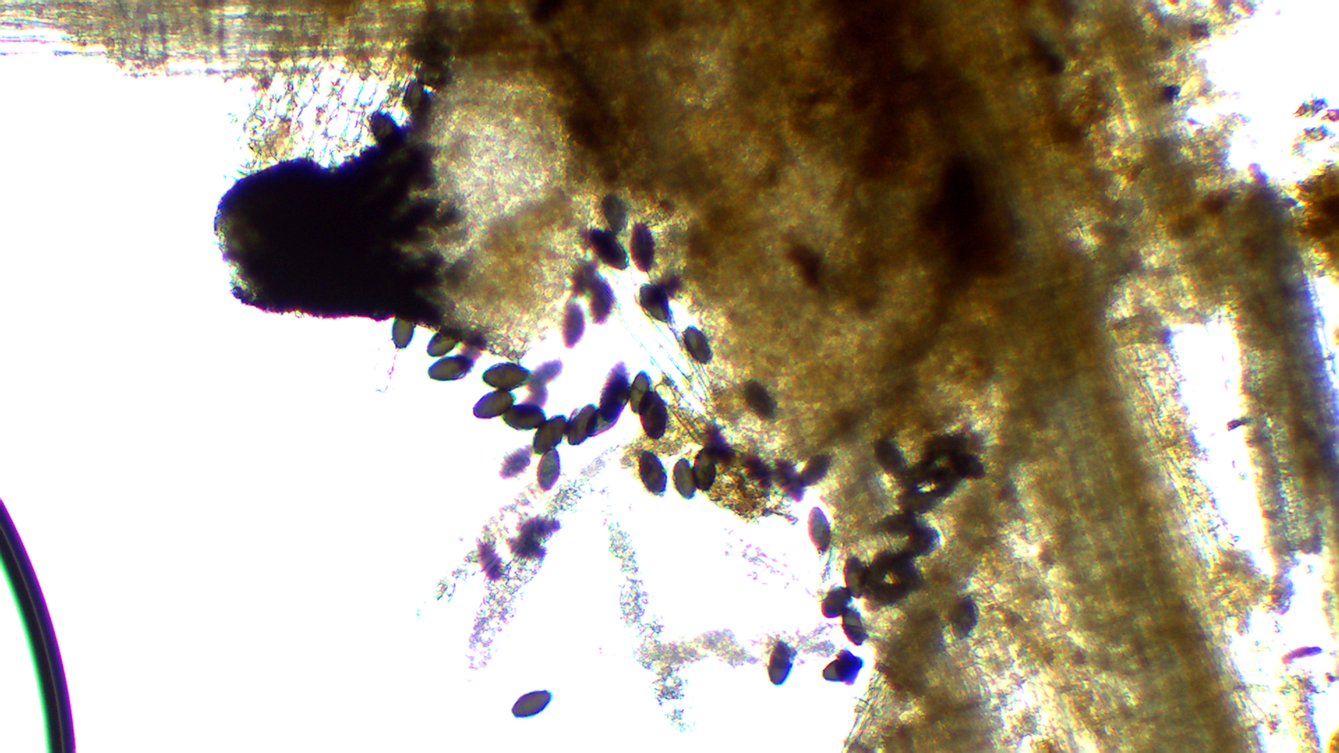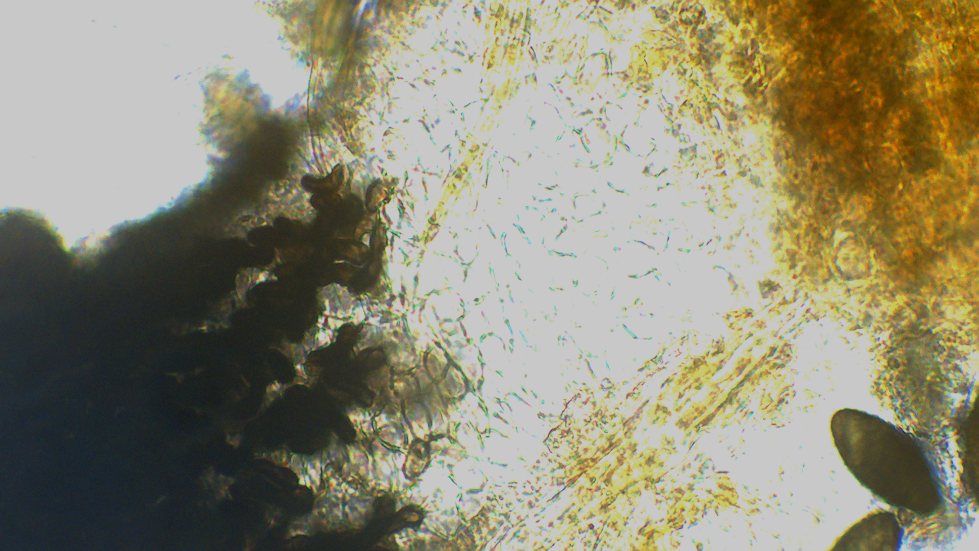 Hier die Basis des Peritheciums (entweder liegt es an der Kamera, oder ich stelle mich zu blöd an, aber ich habe immer Schwierigkeiten die starken Hell-Dunkel-Kontraste gut aufzunehmen)