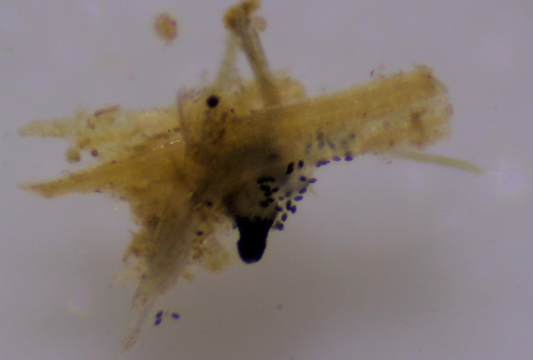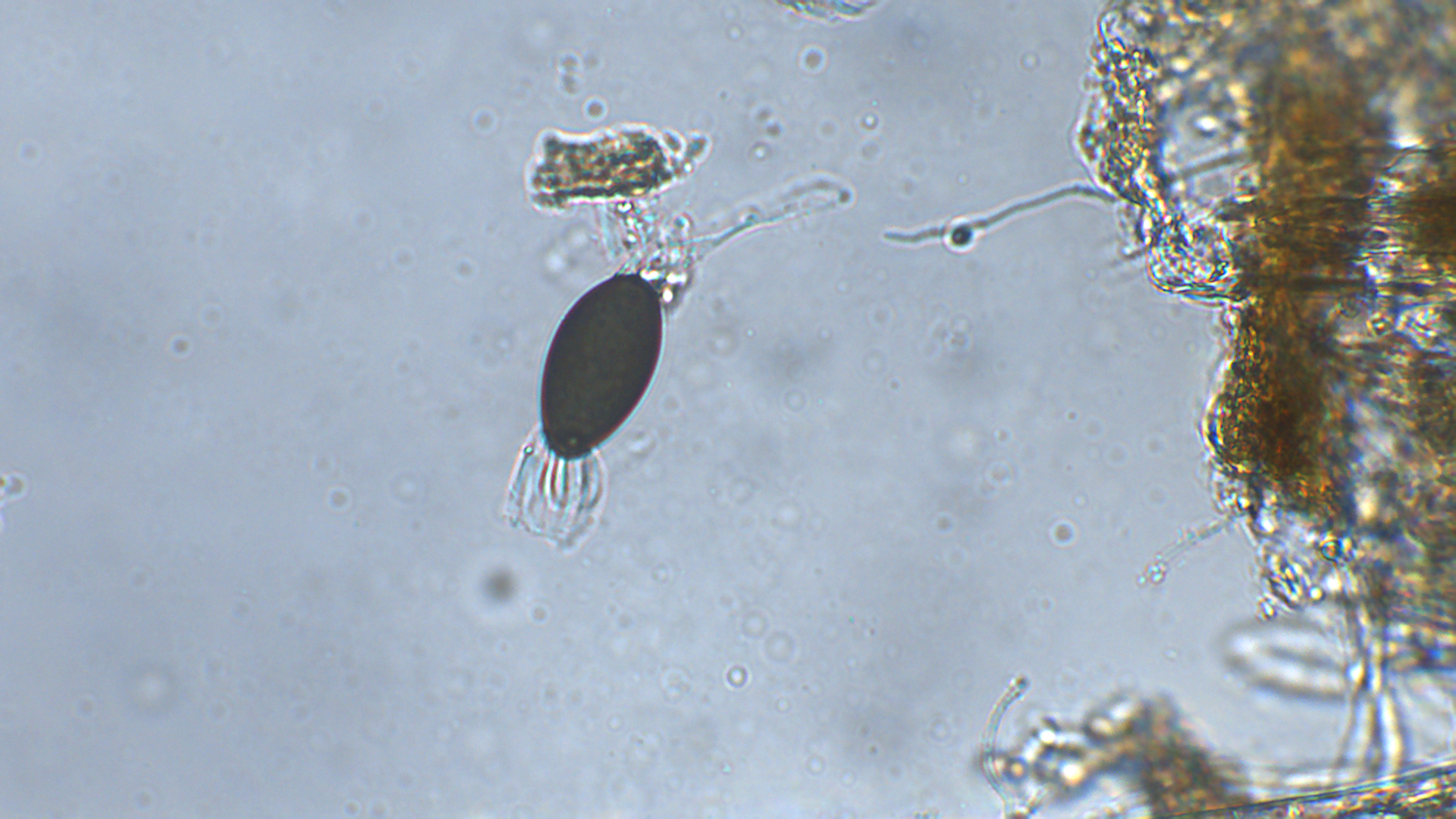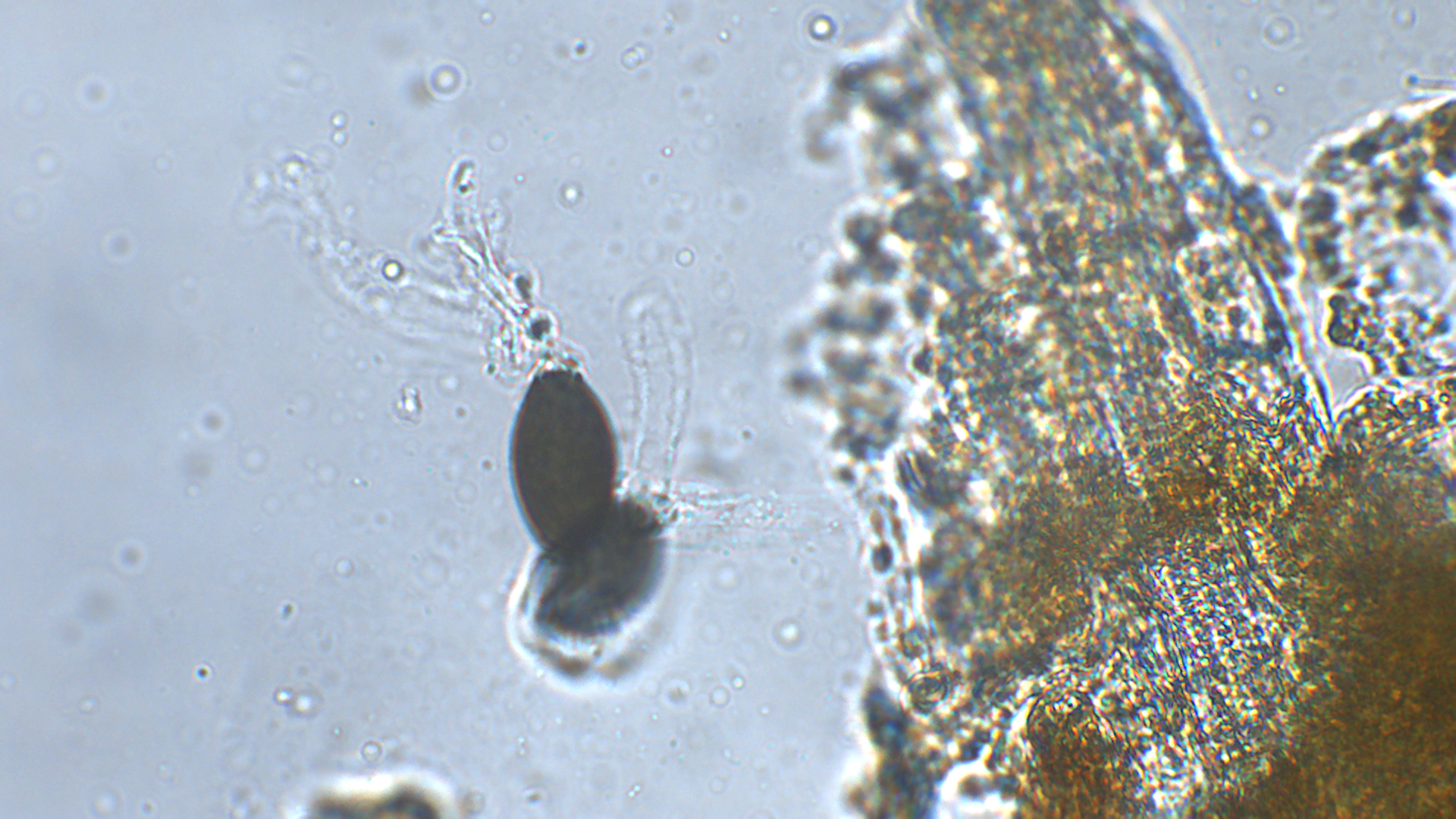 Hier die Basis des Peritheciums (entweder liegt es an der Kamera, oder ich stelle mich zu blöd an, aber ich habe immer Schwierigkeiten die starken Hell-Dunkel-Kontraste gut aufzunehmen)