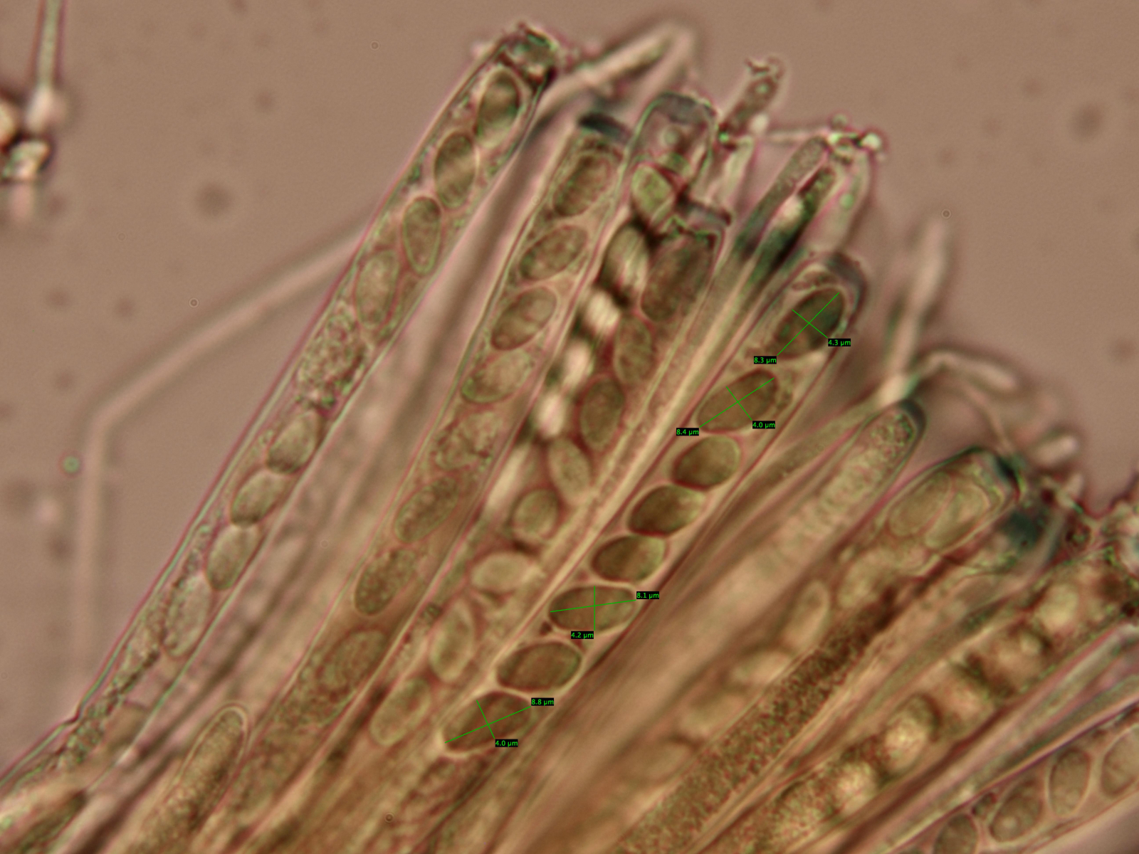 Frage 1) Würdet ihr mir zustimmen, dass es wohl der weitaus häufigere Erlenkätzchenbecherling war? Wie kommt es dann, dass die gemessene Ascusbreite nicht passt?