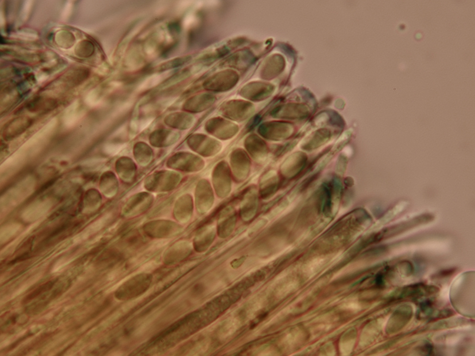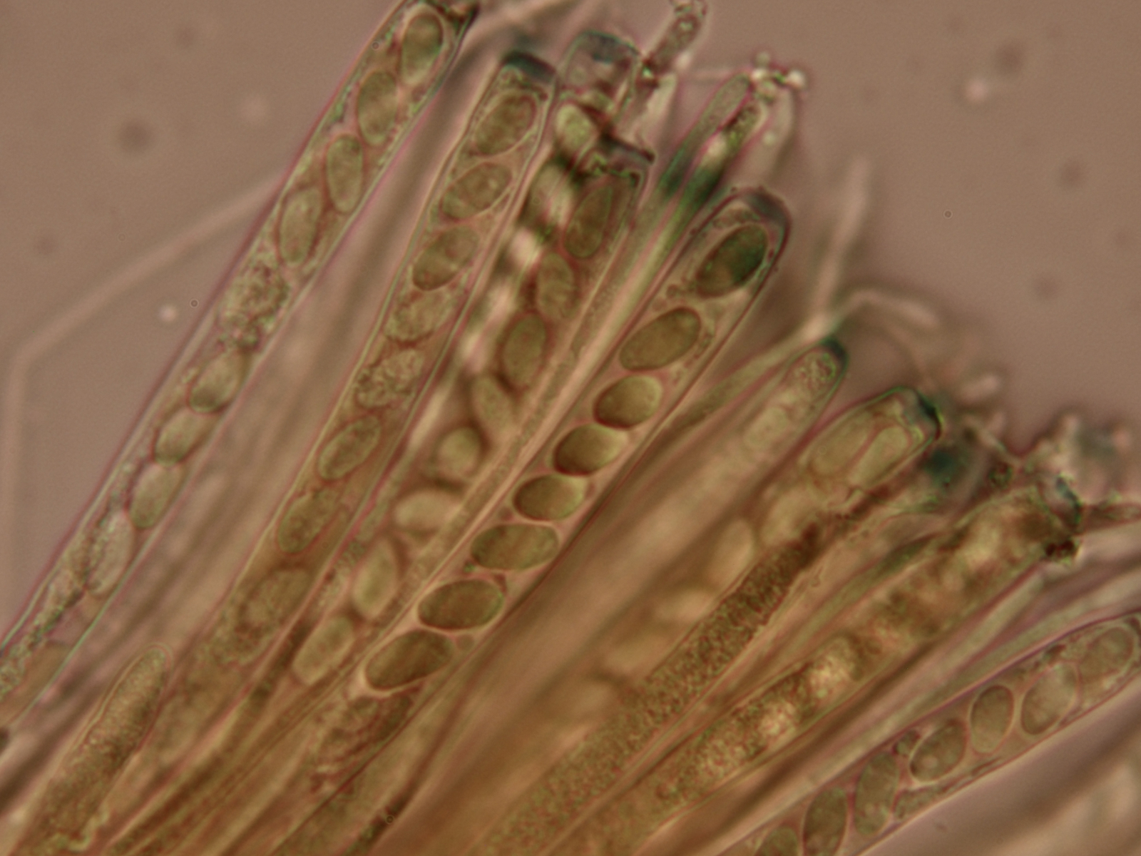 Die Sporen waren zwischen 8,1 - 8,8 Mikrometer lang und zwischen 4-4,3 Mikrometer breit. Ich habe zum Anfärben Melzer benutzt. Wie man auf den Fotos sieht, sind die Spitzen der Asci bläulich.