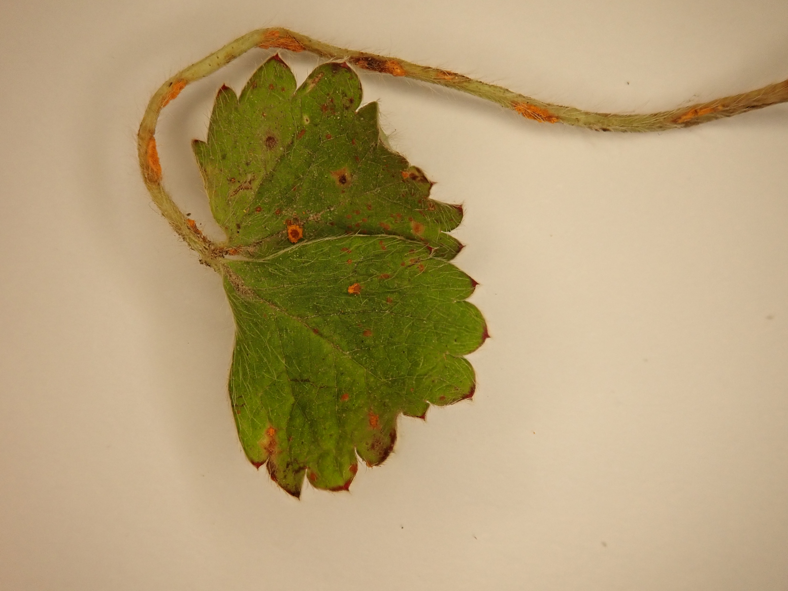 Über Weihnachten habe ich mir genug Wissen über Botanik angeeignet um anzufangen Pflanzen zu schlüsseln. Das habe ich mit der Freundin am Wochenende mal versucht. Dabei ist uns ein Pflänzchen aufgefallen, das aussieht wie eine Erdbeere aber keine ist. Es handelte sich um Potentilla sterilis. Den zugehörigen Phytoparasit mussten wir gar nicht suchen, der war gleich dabei. Mit meinem neuen Handbuch war die Bestimmung auch nicht schwierig, es handelt sich um Phragmidium fragariae, der - anders als der Name vermuten lässt - nie oder fast nie auf Erdbeere wächst. Da lag bei der Benennung wohl eine Verwechslung vor.
