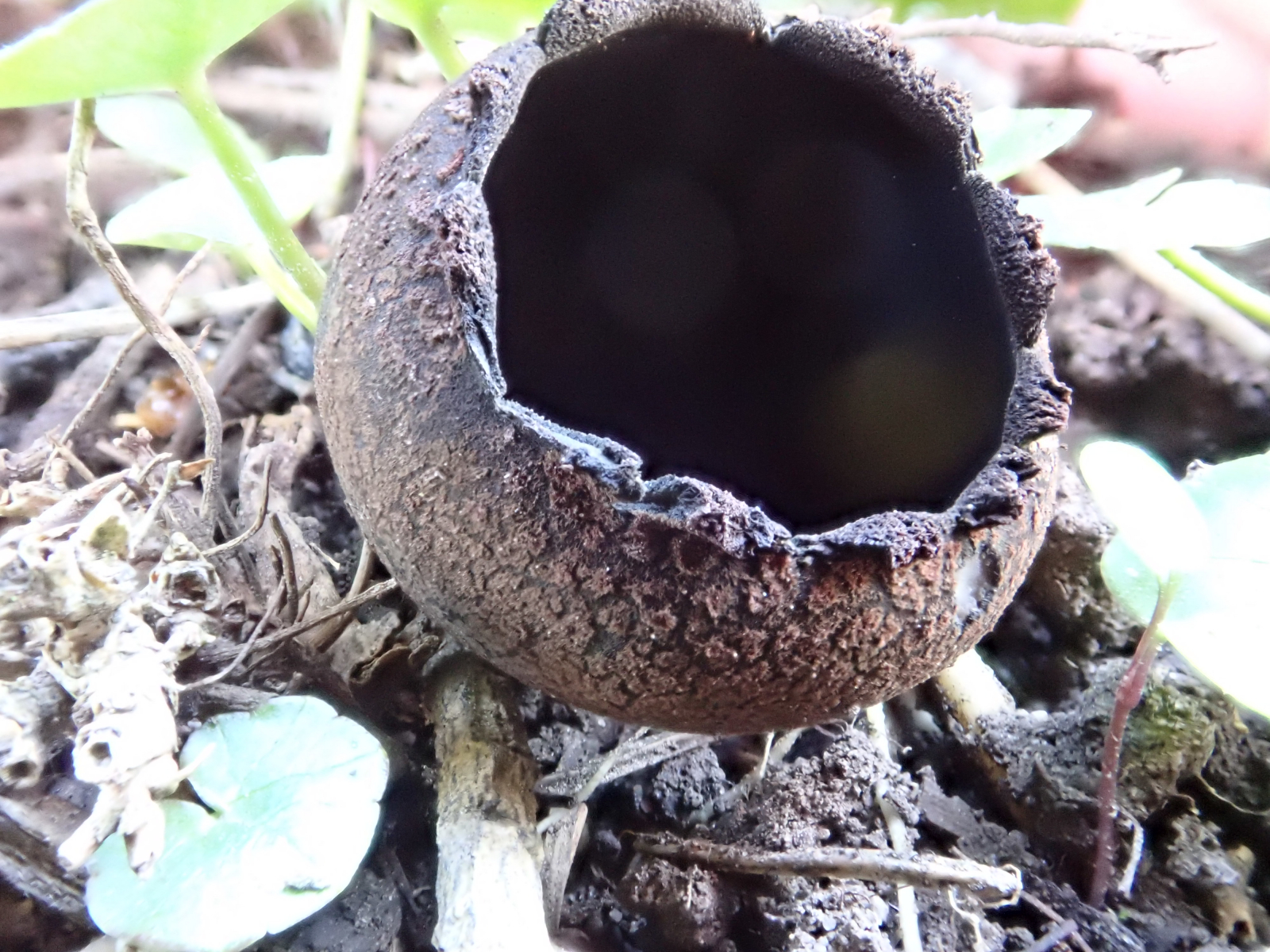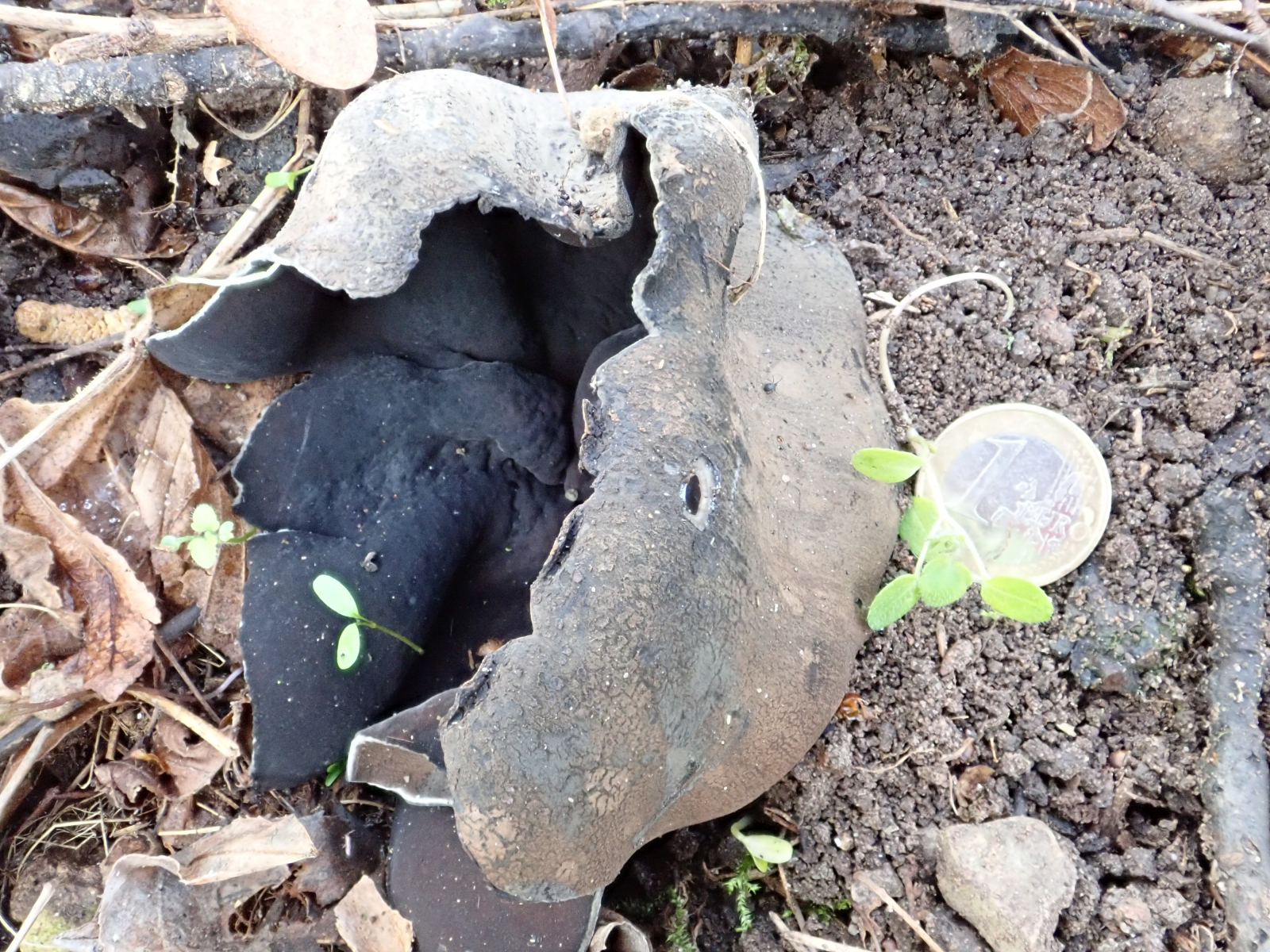 Urnula craterium erscheint schon im auslaufenden Winter, aber da ist sie sehr schwer zu finden, durch ihre schwarzen Fruchtkörper. Da muß man schon genau hinschauen um sie zu finden.