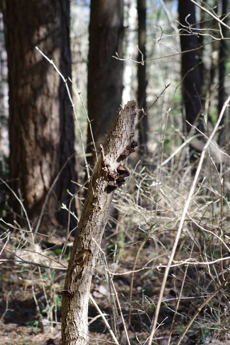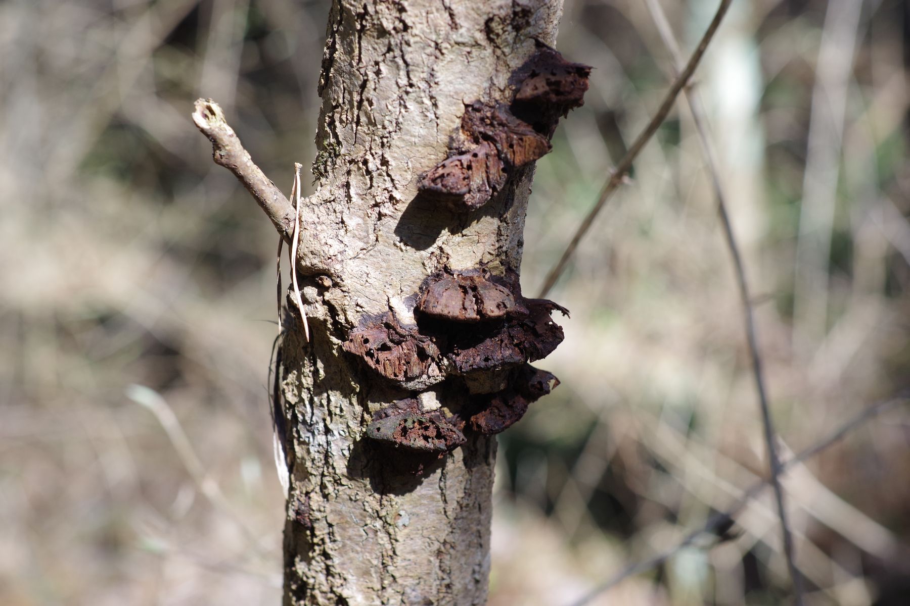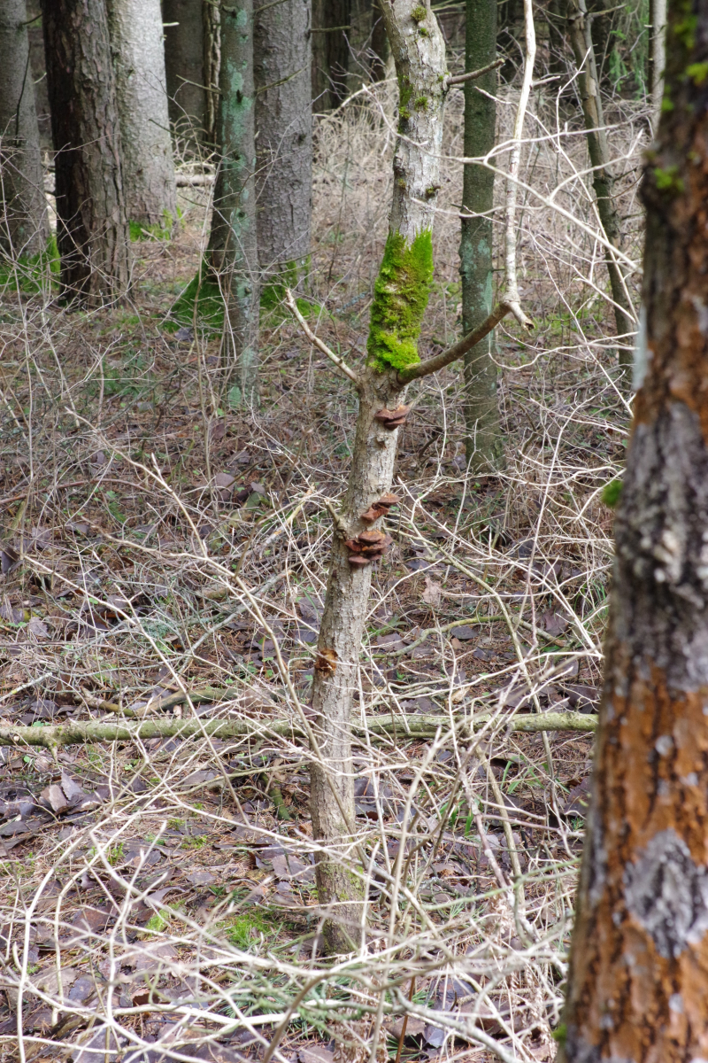 An einer jungen, im Absterben befindlichen Zitterpappel von 7-8 cm Durchmesser: