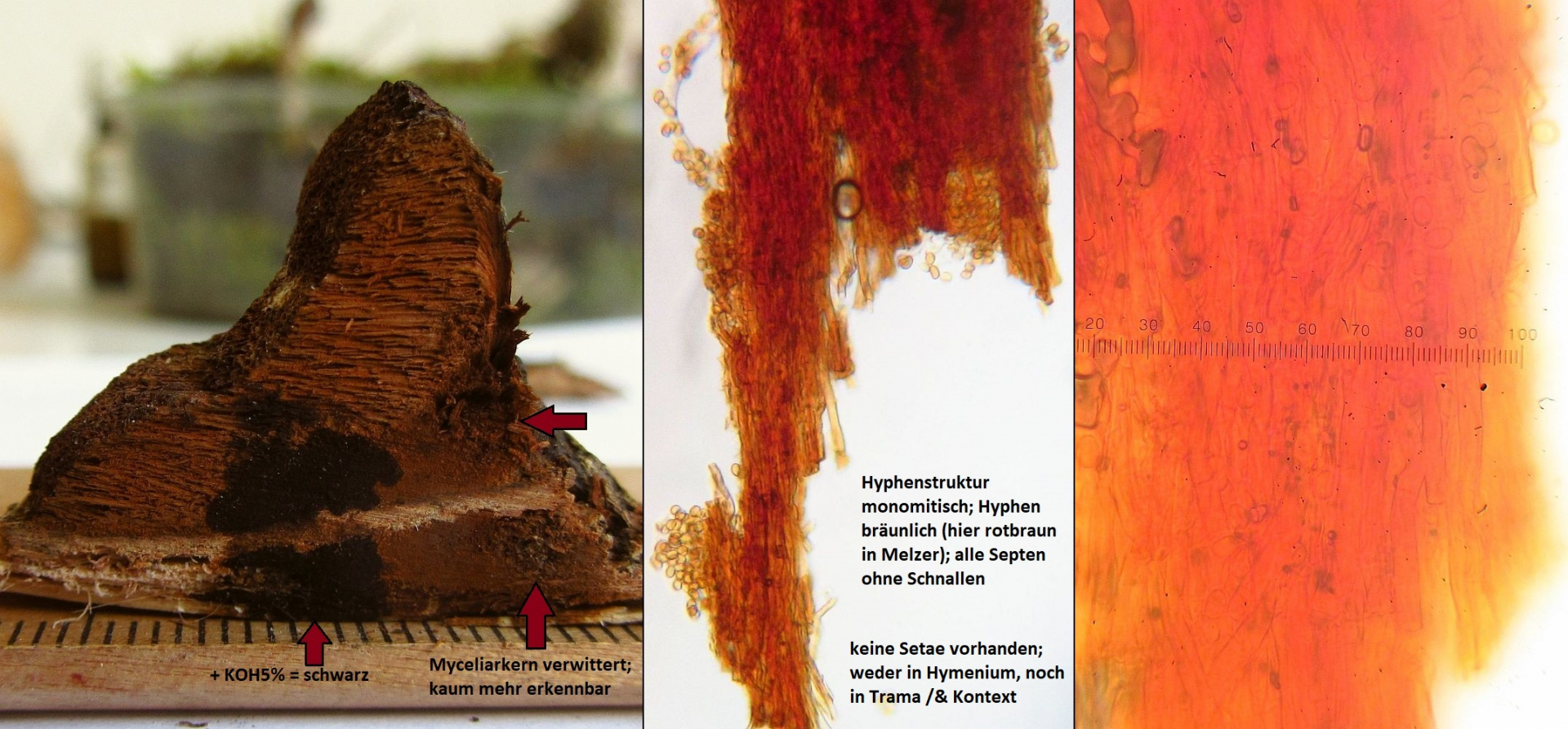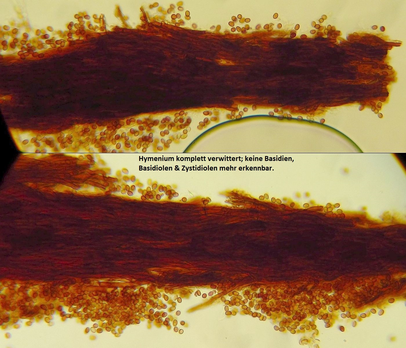 Die "Winterfruchtkörper" sind natürlich stark verwittert, aber das Wesentliche sind die Sporen (nicht dextrinoid, elliptisch - subzylindrisch), das komplette Fehlen jeglicher Setae (die wären bei Arten mit Setae auch bei so verwitterten fruchtkörpern noch erkennbar) und das monomitische Hyphensystem ohne Schnallen.