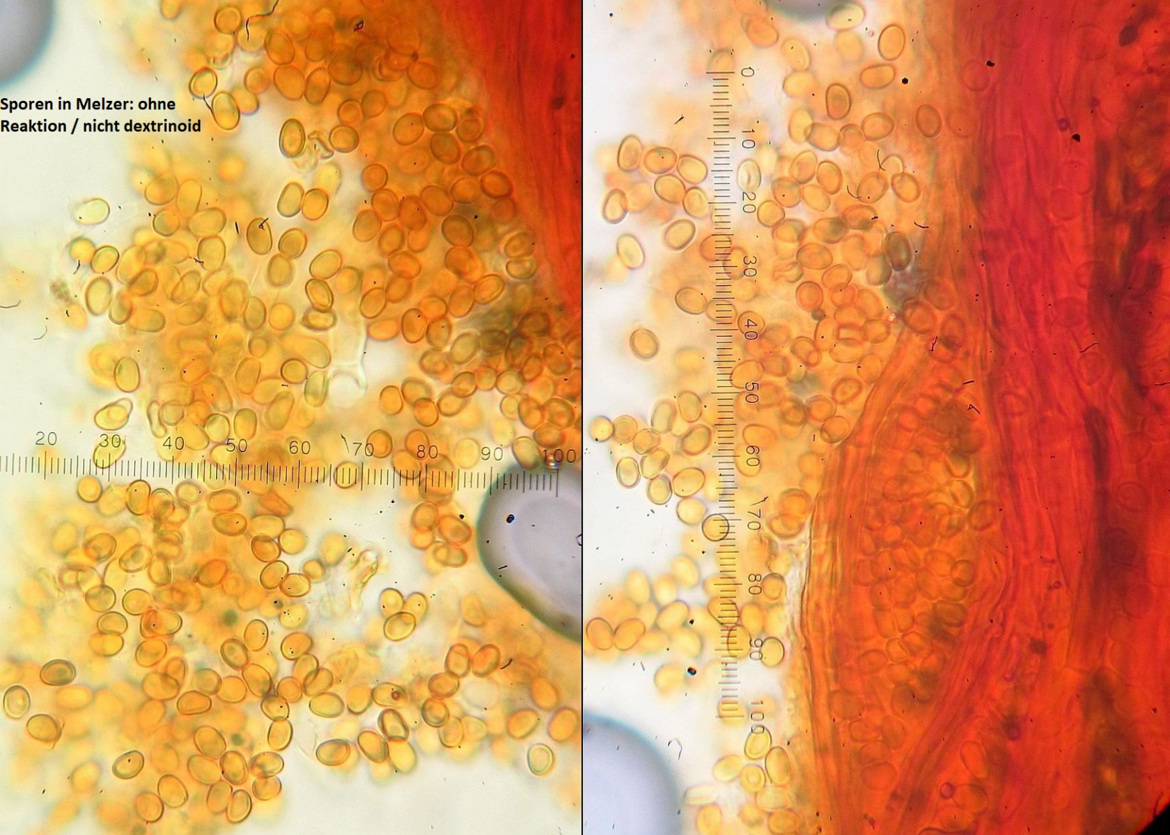 zu Inonotus (=Inocutis) rheades kann ich auch noch Bilder eines recht frischen Exemplares beisteuern. Auf einem liegenden Zitterpappelstamm in Niederösterreich gewachsen. Auffällig neben den Sporen und den fehlenden Seten ist auch der Myzelialkern.