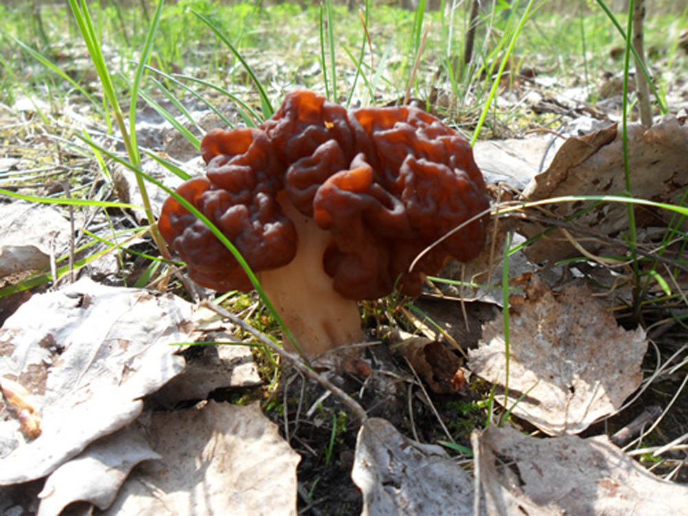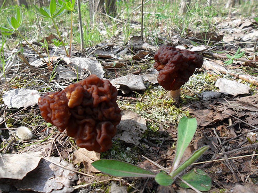 Ich wollte heute nur mal danach schauen, ob die bei uns aufgetauchten Österreichischen Prachtbecherlinge noch stehen geblieben, d.h. verschont worden sind, und siehe da, in der Nähe standen 2 kleine Lorcheln (bei Fichten). Das im Foto zu sehende Exemplar war nur ca. 4,5 cm groß. Deshalb bin ich mir nicht sicher, ob es Frühjahrslorcheln sein könnten. Diese kenne ich vom Habitus auch nur als ziemlich gedrungene Pilze. Riesen- oder Zipfel-Lorchel dürften aber ausscheiden.
