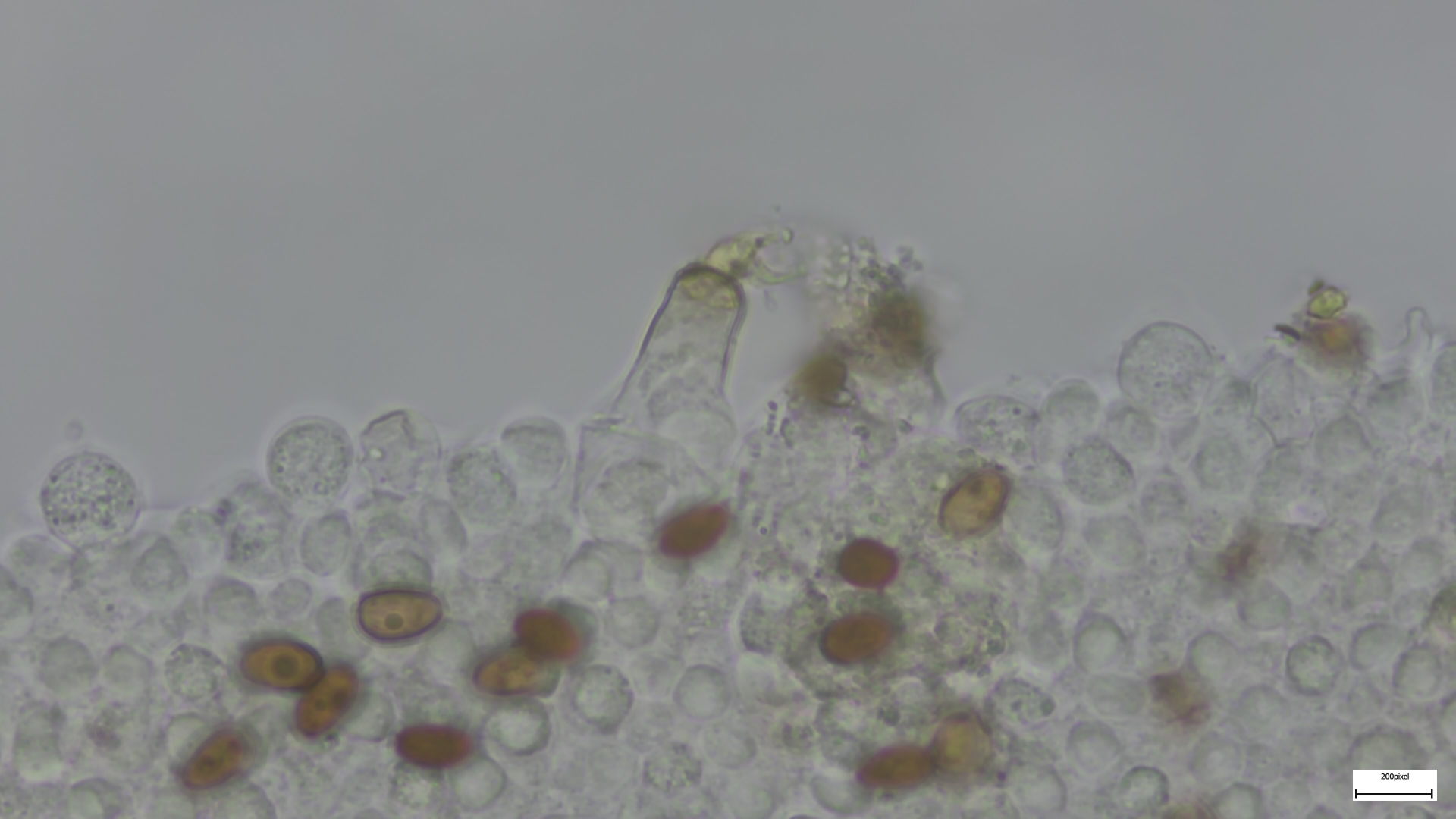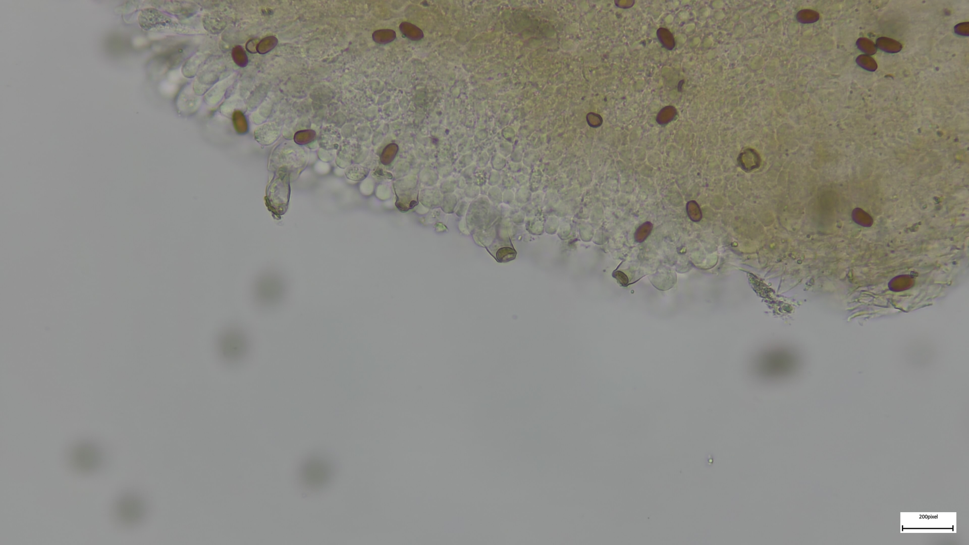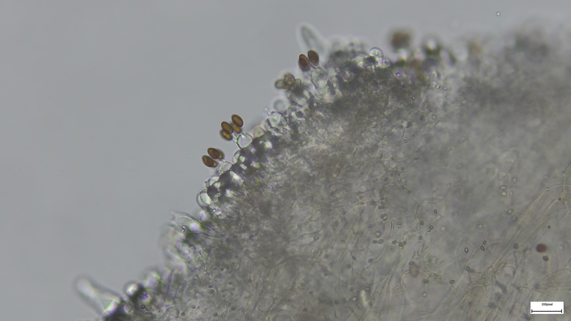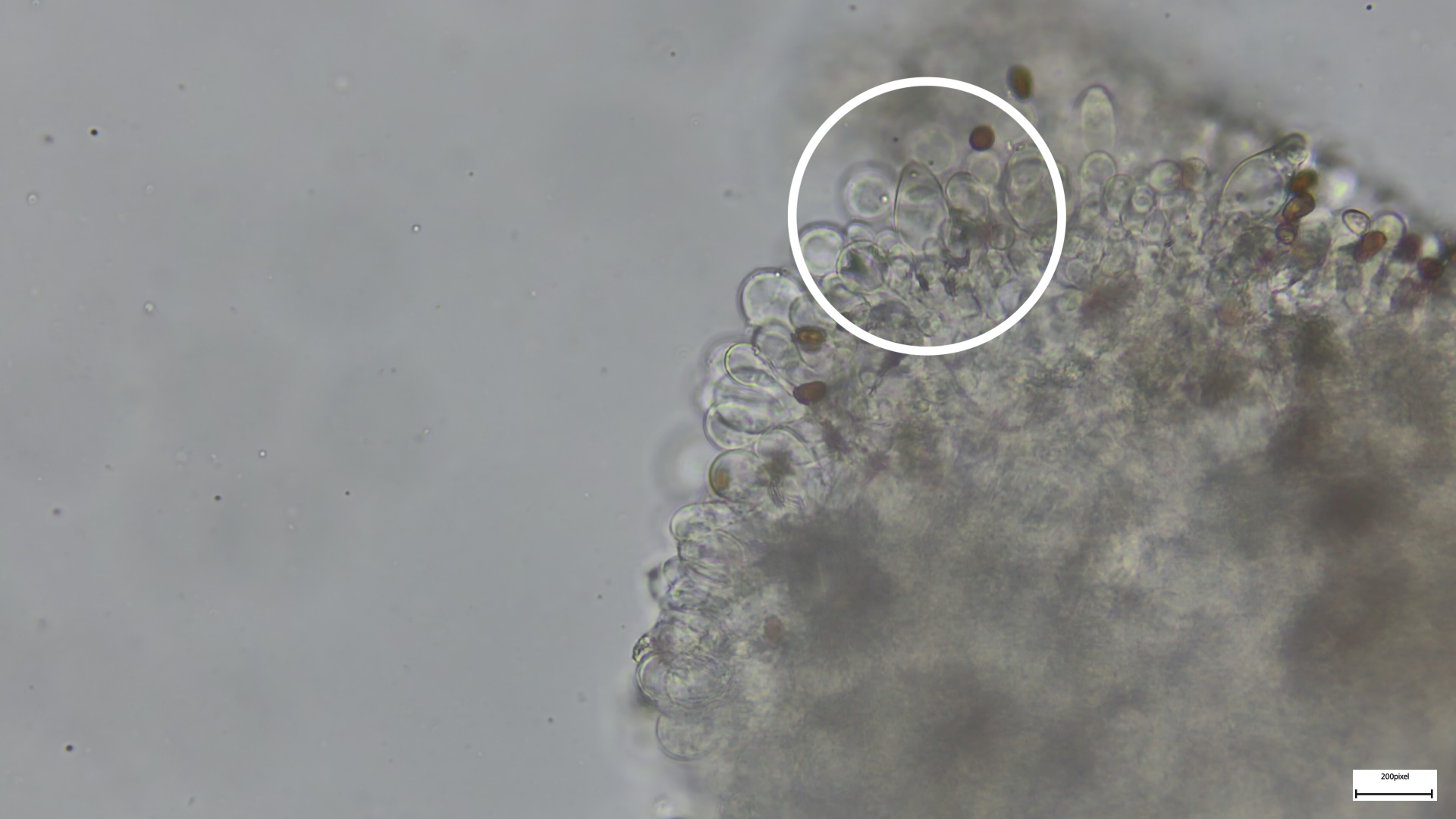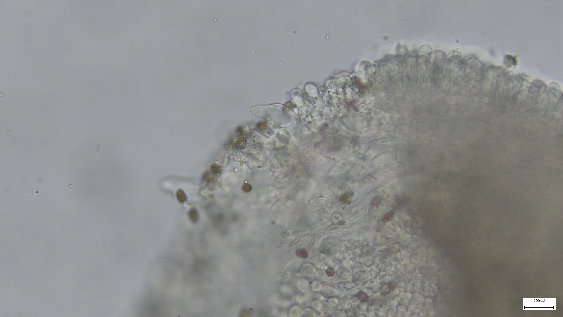 Bei den Mikromerkmalen passen die engstehenden ballonförmigen (umgekehrt birnenförmigen) Parazystiden auf der Schneide. Pleurozystiden vereinzelt und utriform. Sporen 8,18x4,92 (1,66). Häufig ovoid, seltener zylindrisch (was mich anfangs etwas irritiert hat, schließt Niveobadia wohl aber nicht aus?).
