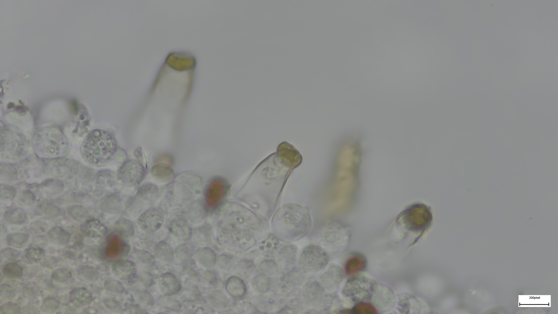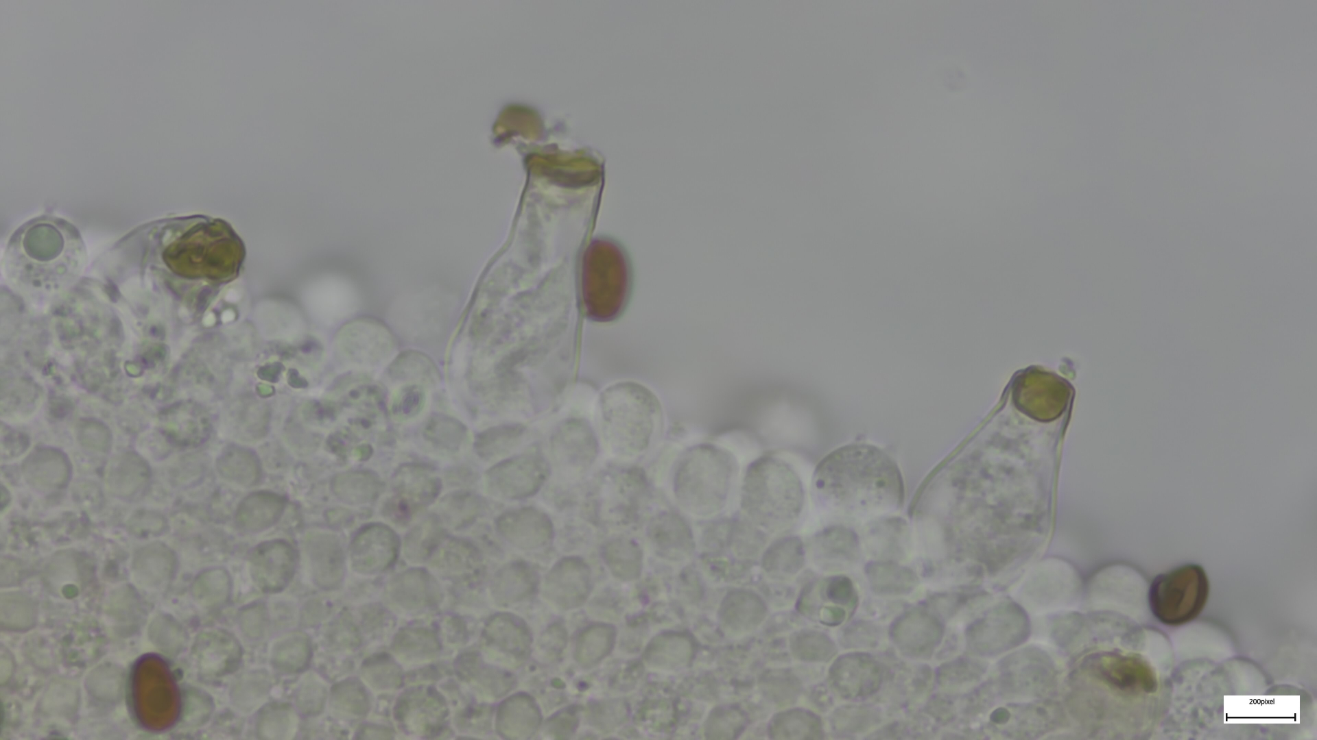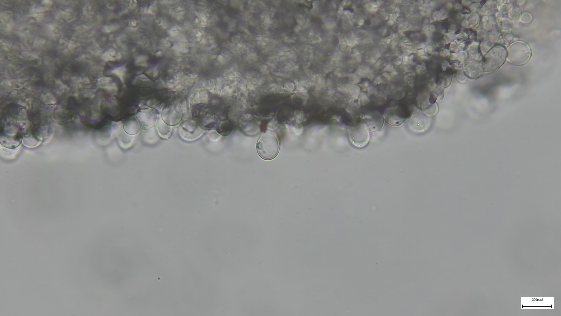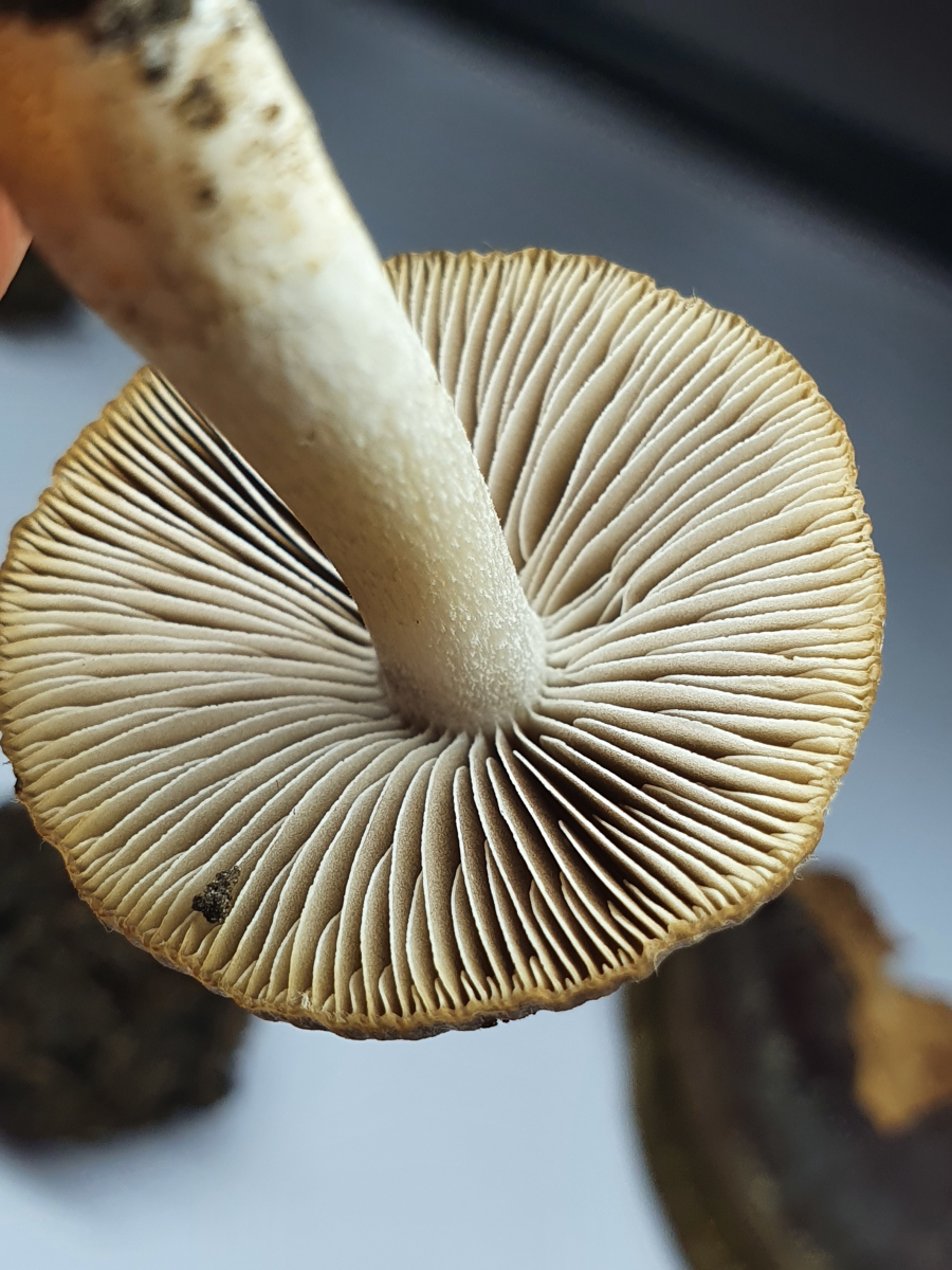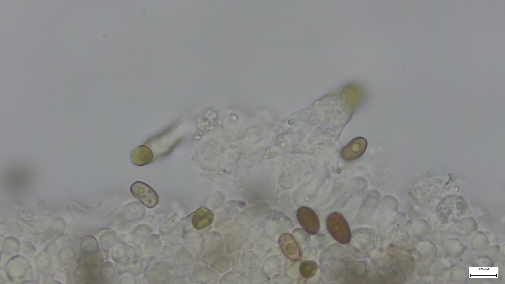 Bei den Mikromerkmalen passen die engstehenden ballonförmigen (umgekehrt birnenförmigen) Parazystiden auf der Schneide. Pleurozystiden vereinzelt und utriform. Sporen 8,18x4,92 (1,66). Häufig ovoid, seltener zylindrisch (was mich anfangs etwas irritiert hat, schließt Niveobadia wohl aber nicht aus?).