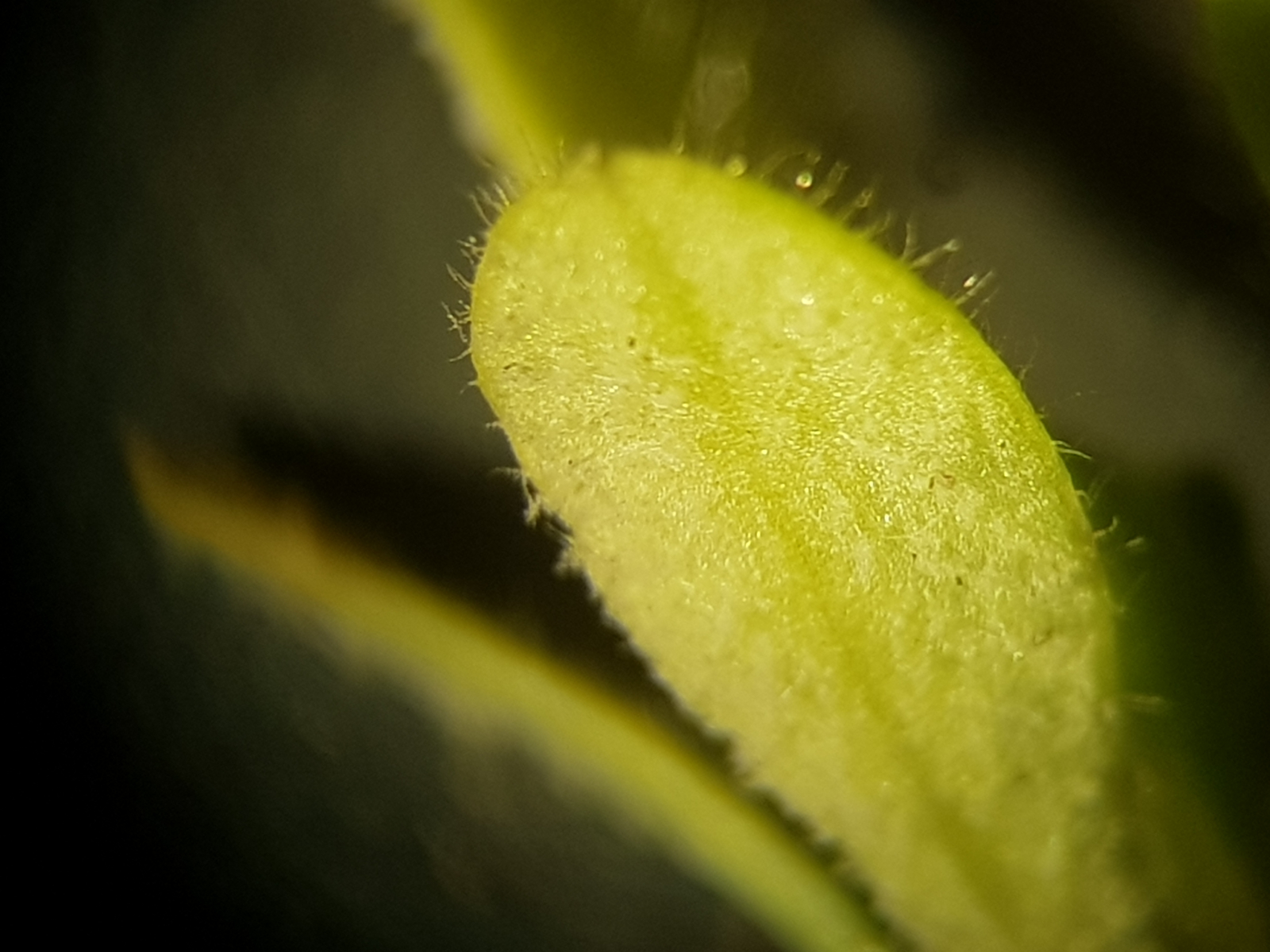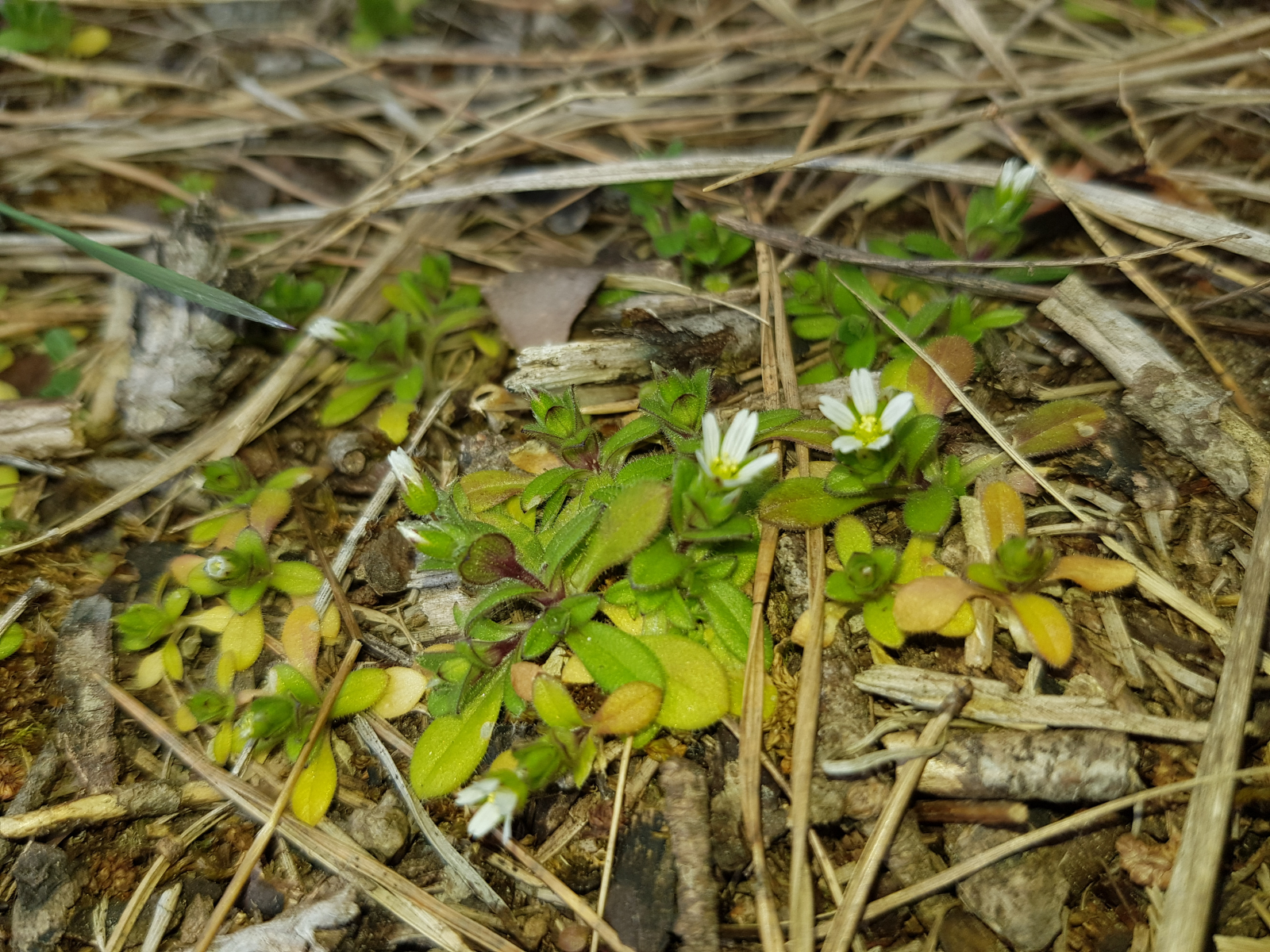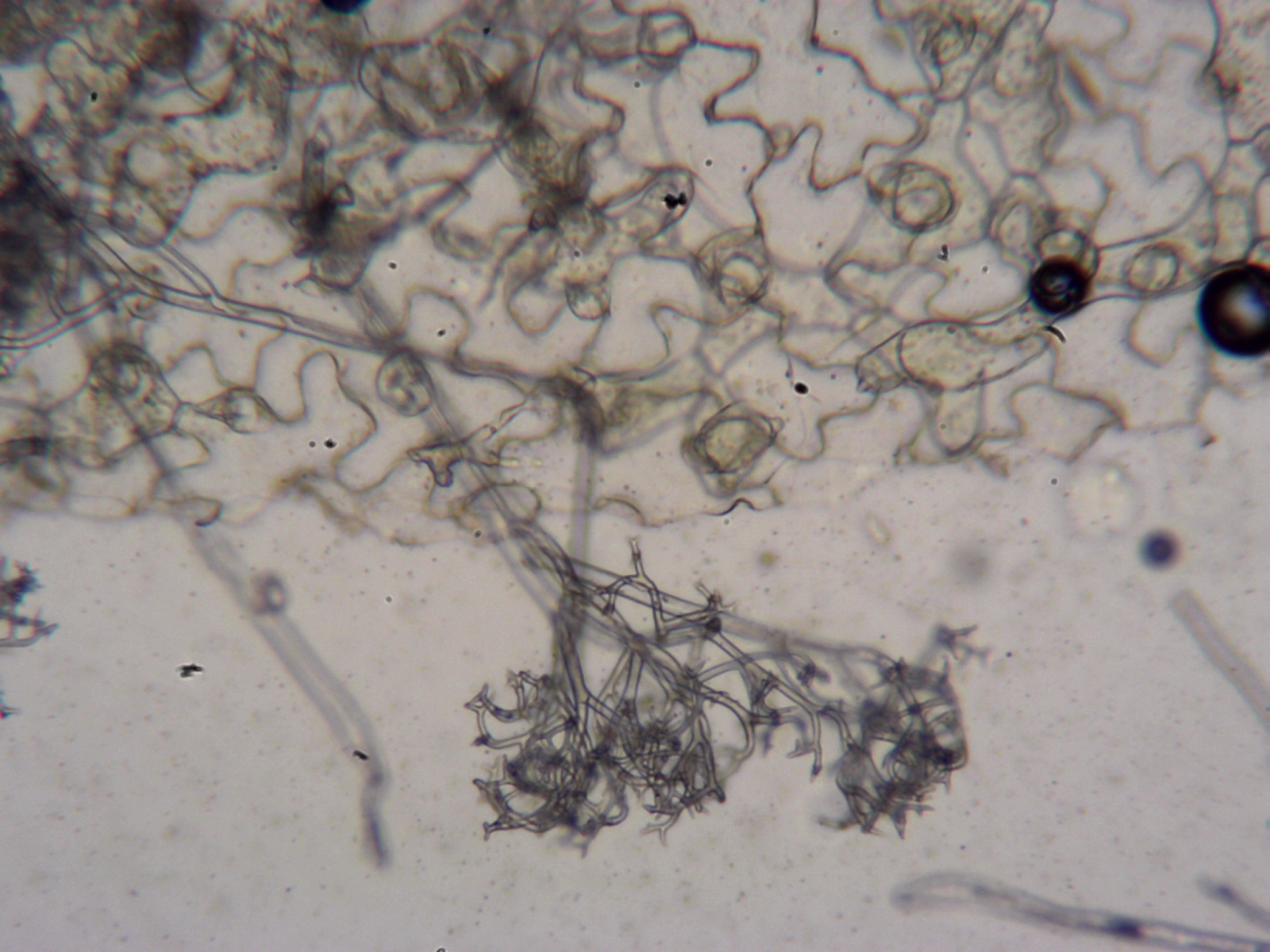 Heute fand ich ein kleines Hornkraut mit auffällig vergilbten Blättchen. Das Wirtspflänzchen war Cerastium semidecandrum. Dank an Arthur Händler aus der Pflanzenbestimmungsgruppe für die Bestätigung meiner Bestimmung! Auf den Blattunterseiten fand sich ein sehr feiner weißlicher Belag. Unter dem Mikroskop waren die typischen Konidienständer von Peronospora zu finden. Die Sporen waren 17-21 x 13-15 µm groß. Mit der dicken Bibel von Friedemann Klenke und Markus Scholler komme ich glatt zu P. paula.