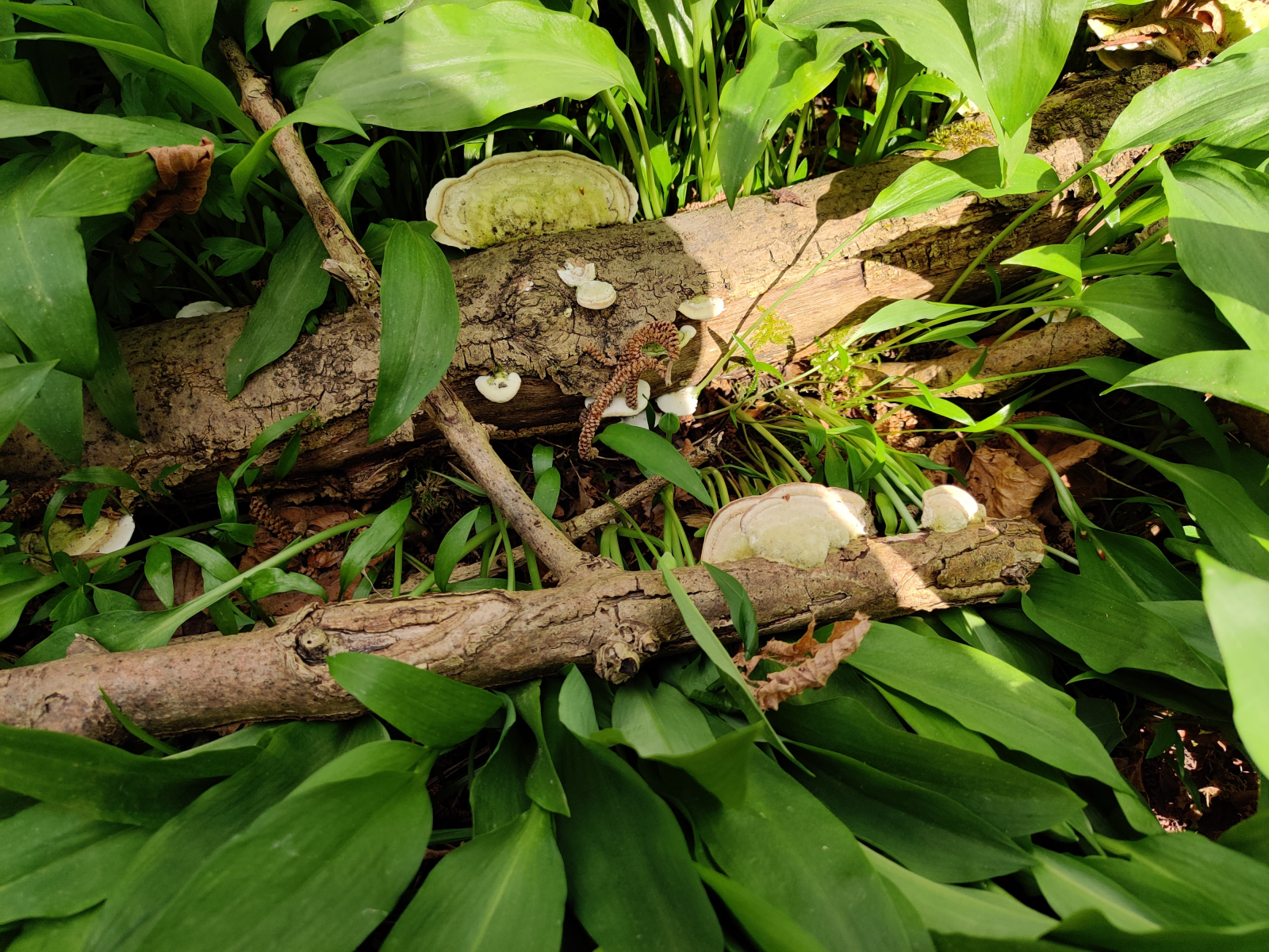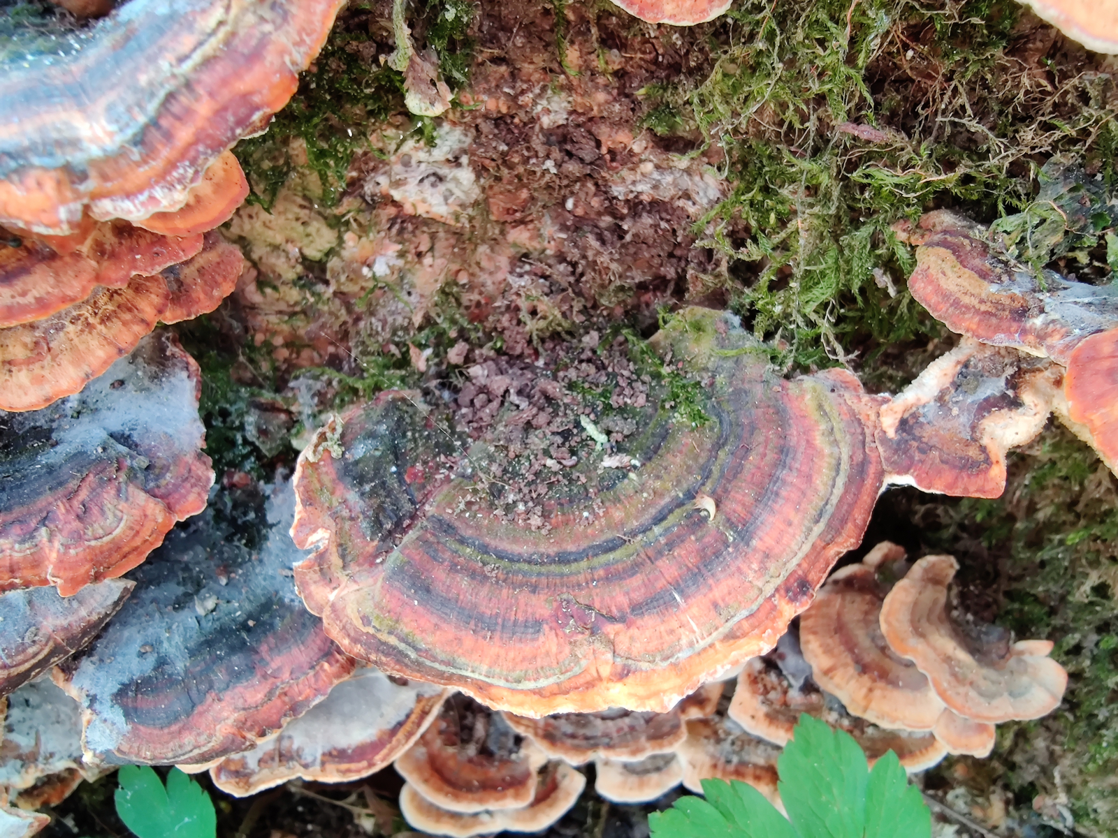 2.Dann bin ich über diese Fruchtkörper gestolpert. Ich denke es sind Trameten, womöglich die Schmetterlingstramete(Trametes versicolor).:/