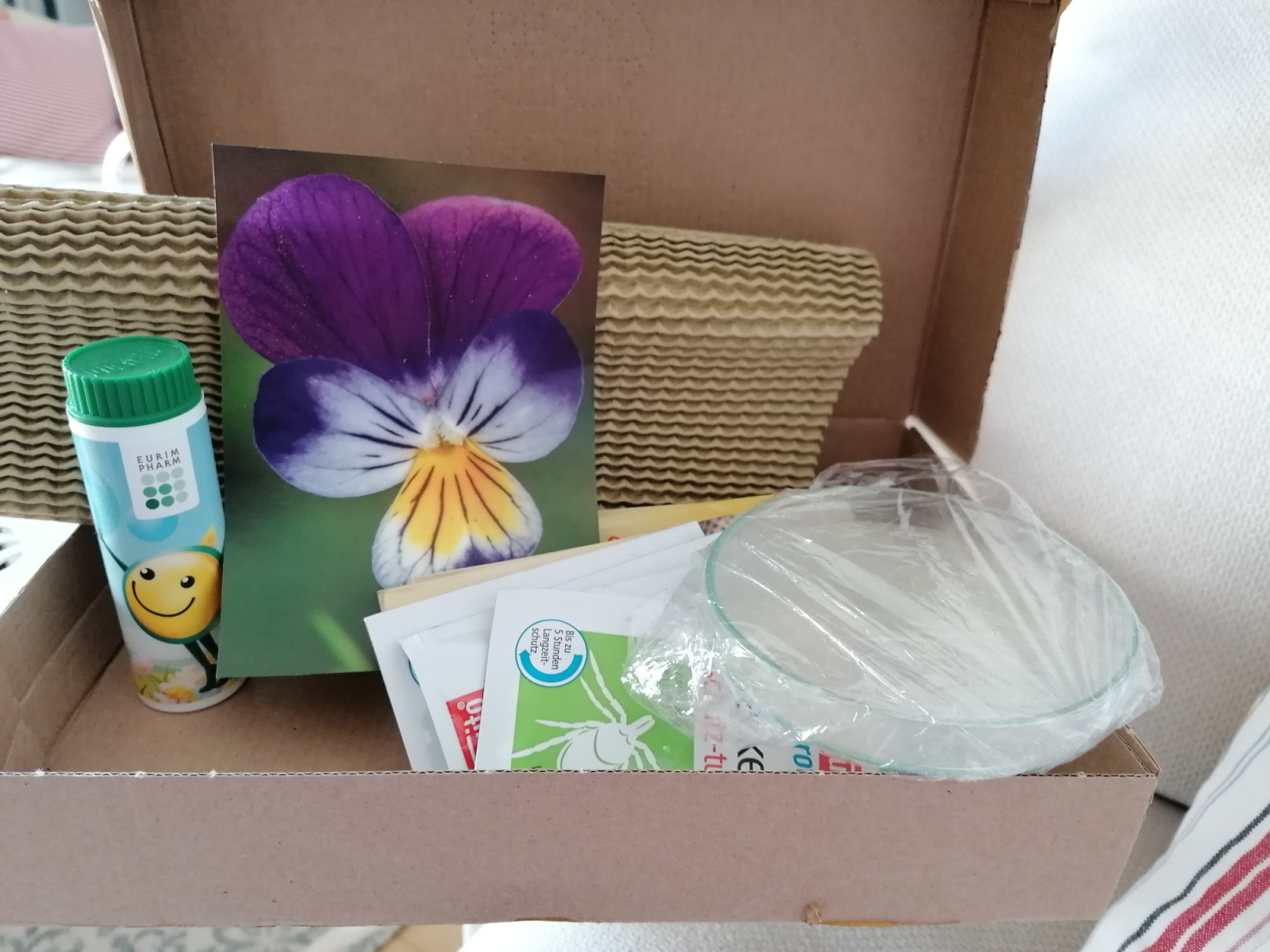 Das Päckchen ist vollgestopft mit guter Sonnenlaune: Eine schöne Karte, natürlich der Saharastaub, lauter Tüchlein, die man als Waldgänger gut gebrauchen kann (Zeckenstop und Reinigungstücher), und für die gute Laune an Schnee-Frühlingstagen