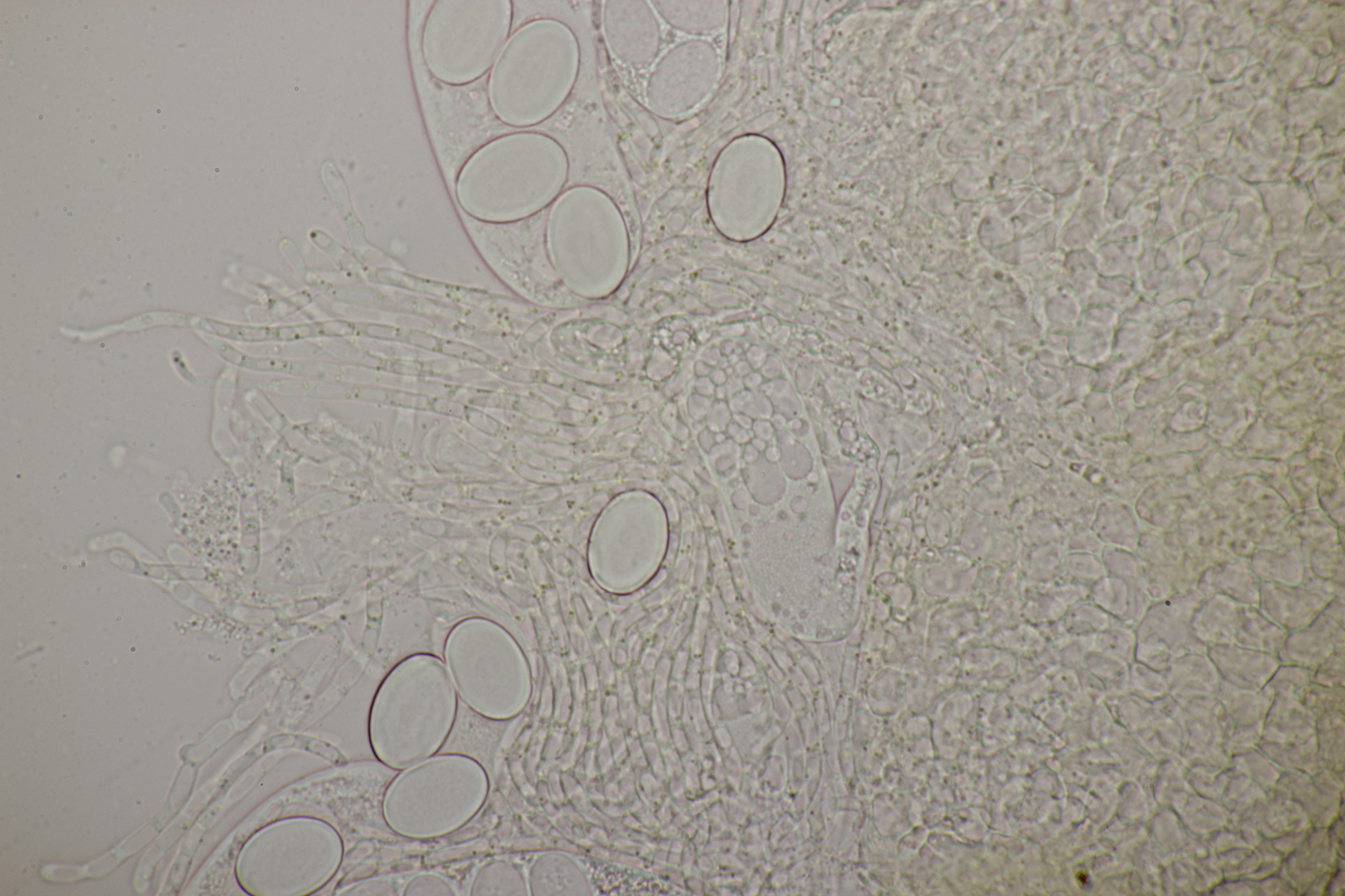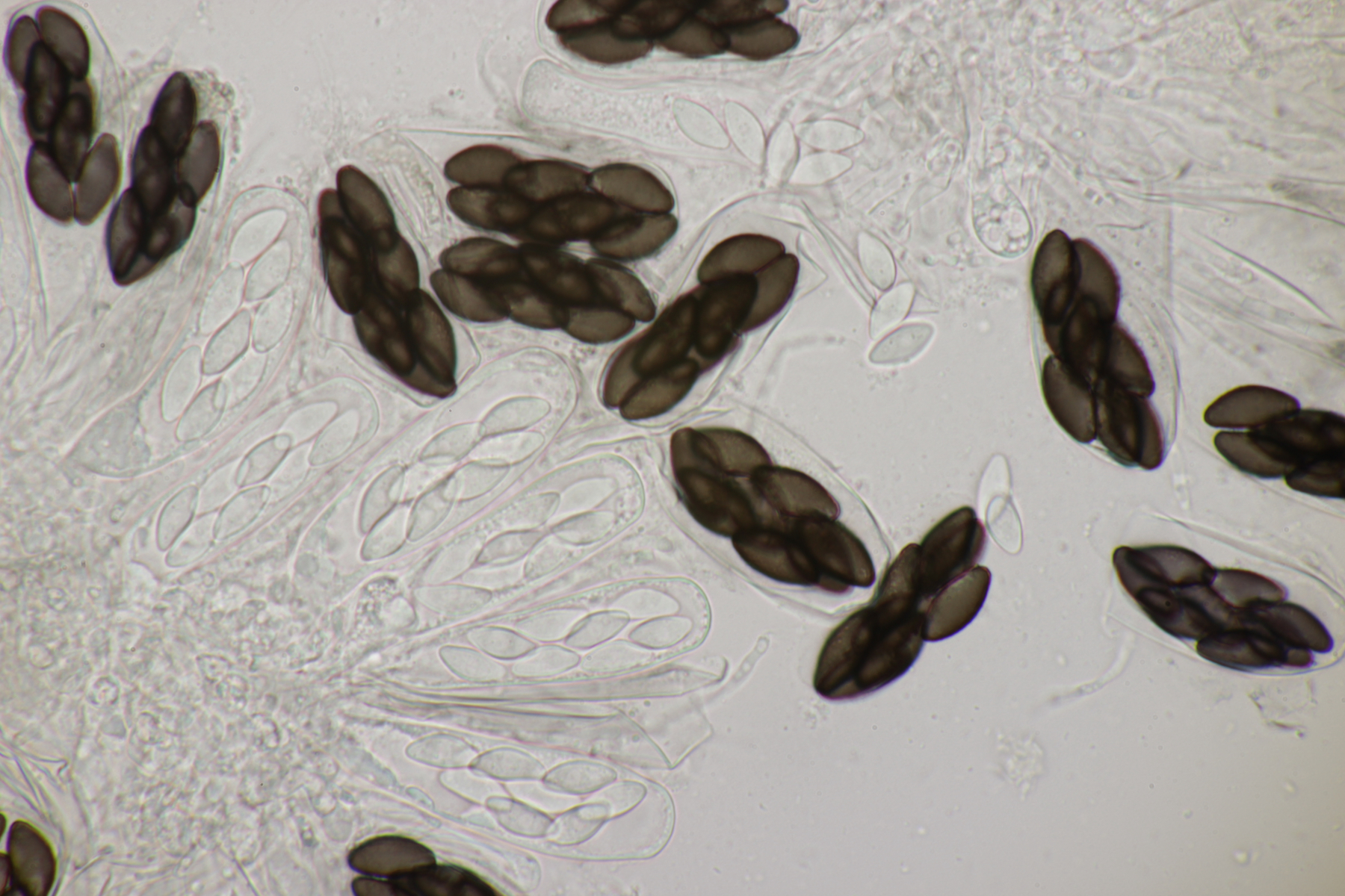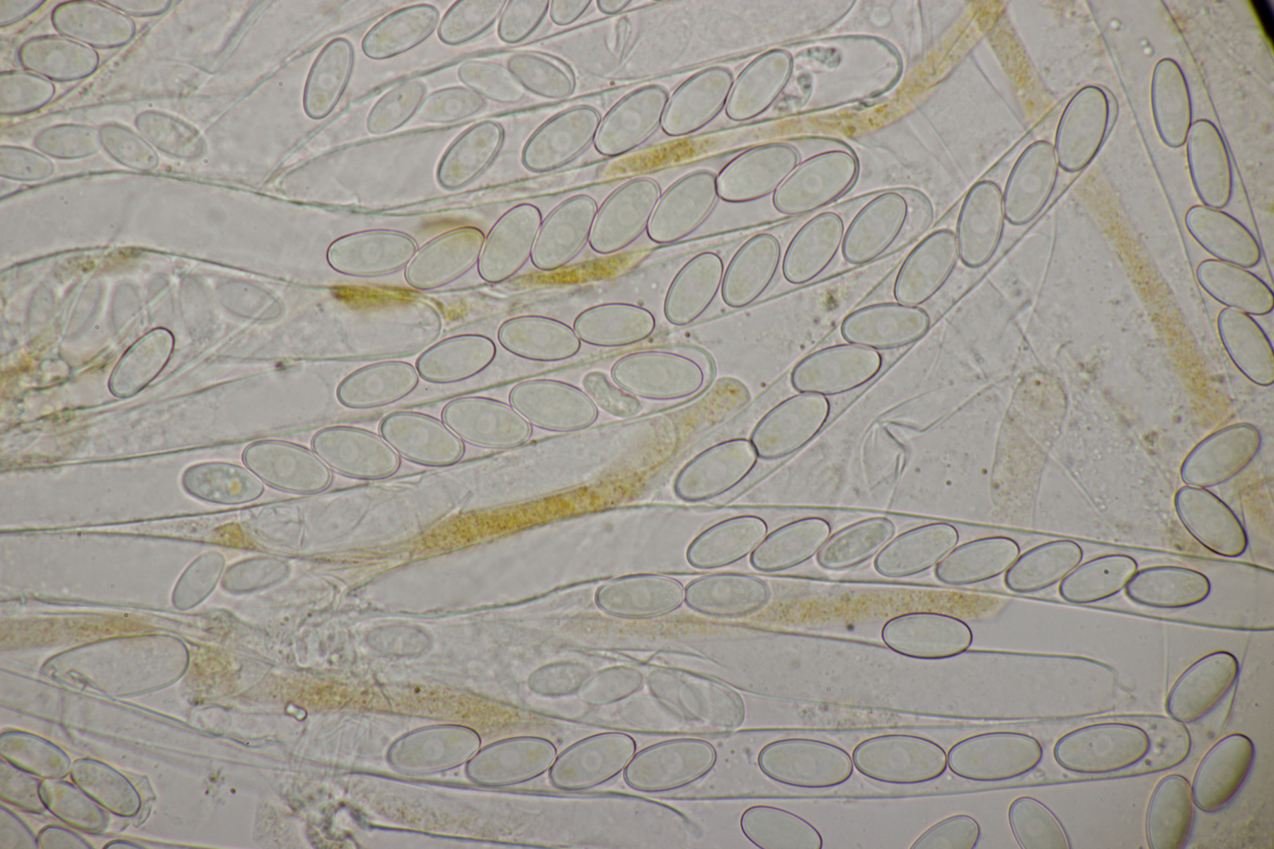 2. Saccobolus depauperatus mit Sporenclustern von 37 µm x 12 µm und Sporen von (14-16) µm x 7 µm