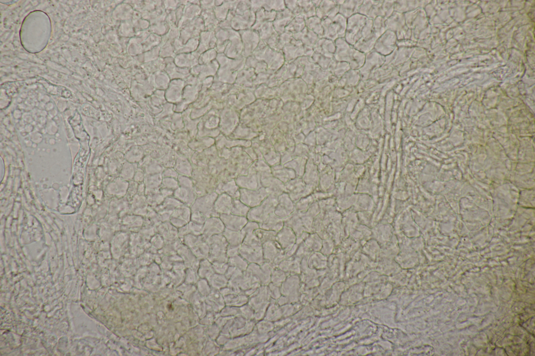 3. Versteckt unter einem Köttel dann eine handvoll relativ großer, leuchtend orange-gelber Fruchtkörper. Sporen messen (11-12) µm x (5-6) µm und sind glatt. Mit dem Doveri-Schlüssel lande ich mit uniseriaten, zylindrischen Asci bei Cheilymenia, aber da paßt dann mit den kleinen Sporen keine Art. Haare sind scheinbar keine vorhanden und es gibt nur rundliche Zellen auf der Außenseite. Eine rechte Idee habe ich im Moment nicht dazu... oder ist das eine Cheilymenia granulata, bei der die Sporen einfach zu klein geraten sind?
