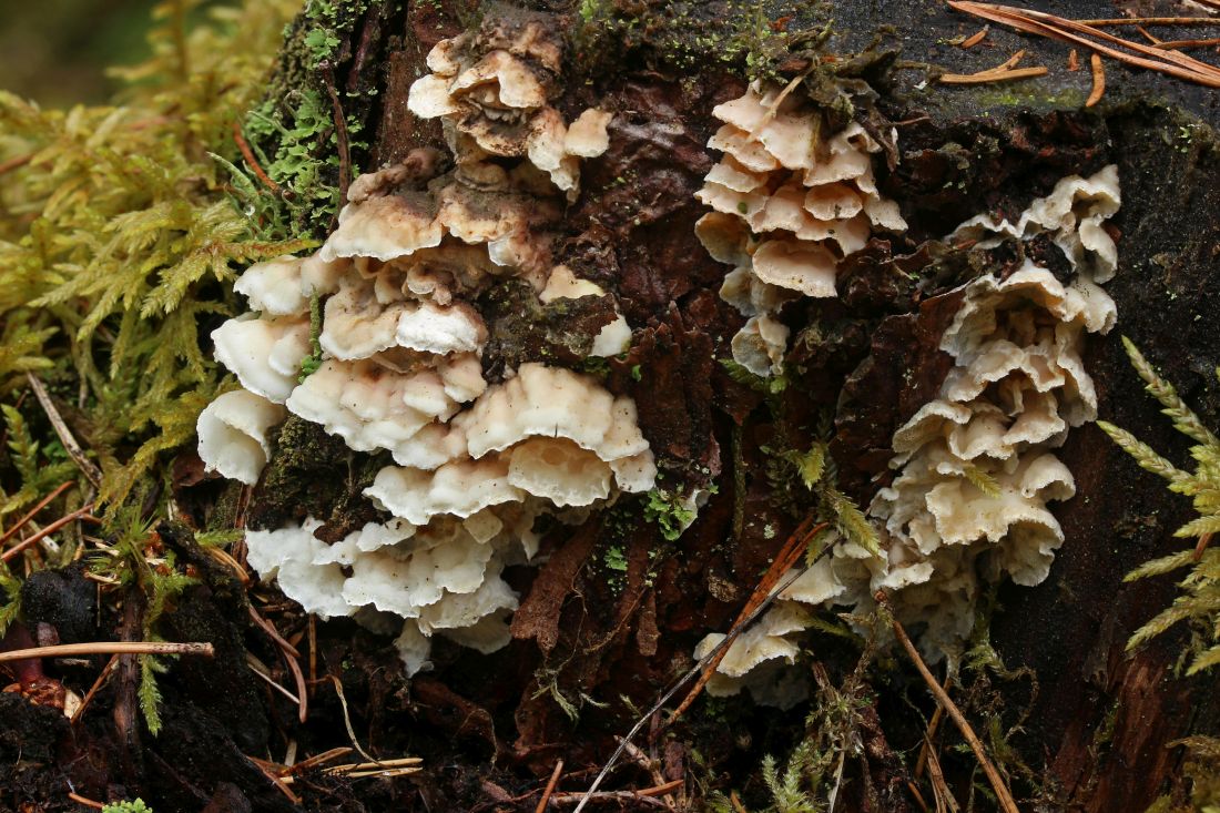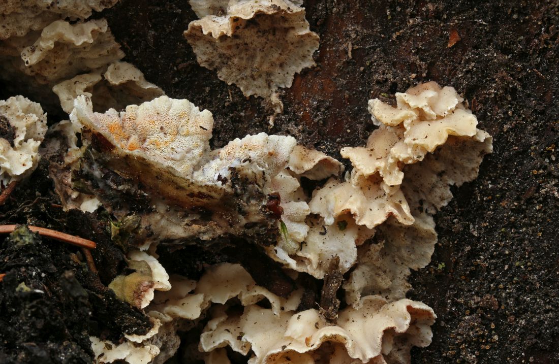 Skeletocutis amorpha ist hier an Kiefern recht verbreitet bis häufig: