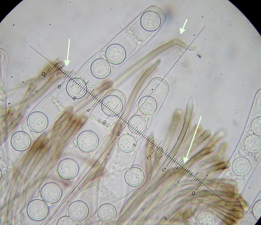 (Die Familienzuordnung stimmt natürlich nicht mehr, mittlerweile bei den Sarcosomataceae) Günter Bauer beschrieb schön, wie sich die Paraphysen unterscheiden. So sind sie bei Ps. episphagnum (damals lief sie noch unter anderem Namen) sehr stark miteinander durch eine dunkelbraune Masse verkittet und in Wasser kaum auseinanderzubringen. Günter hat sie in Kalilauge erhitzt und dann mit Wasser ausgewaschen, um sie einzeln zu trennen und dann die teils bizarre Form der Paraphysen herauszuarbeiten. So kann man die Arten gut trennen.