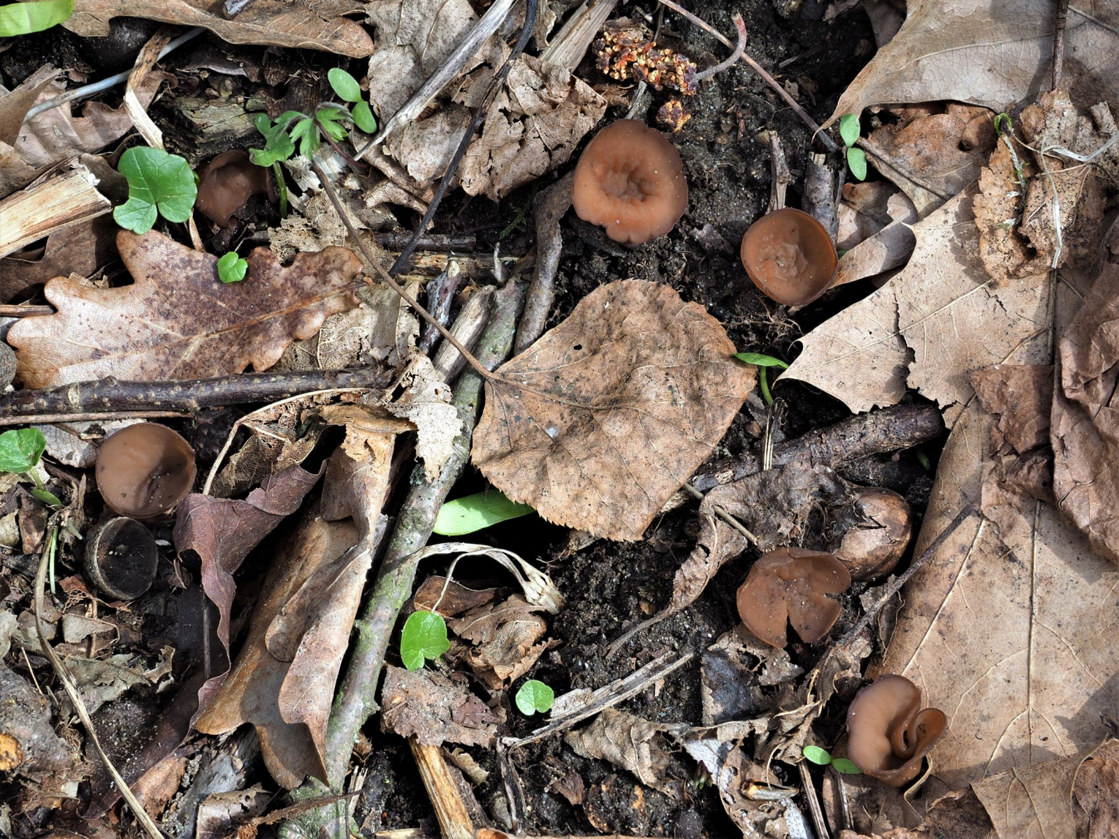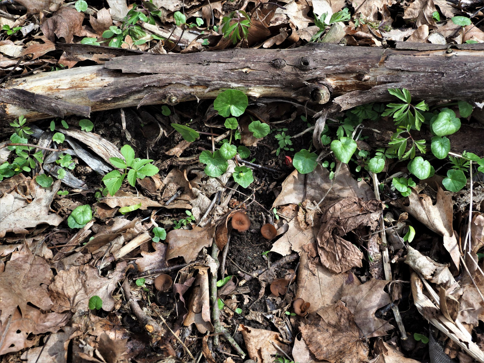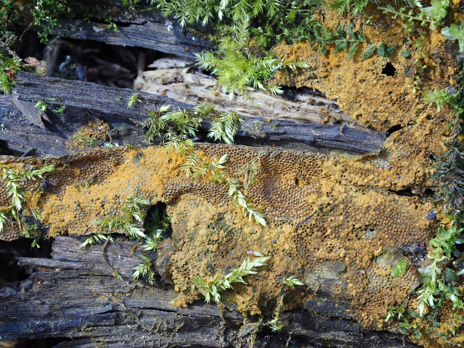 Wir waren natürlich auch gespannt, Pilze zu finden. Überrascht hat uns ein kleiner Fund Anemonen-Becherlinge und ein gelbes Lager mit bienenwabenartiger Struktur, das ggf. von Ceratiomyxa fruticulosa herrühren könnte.