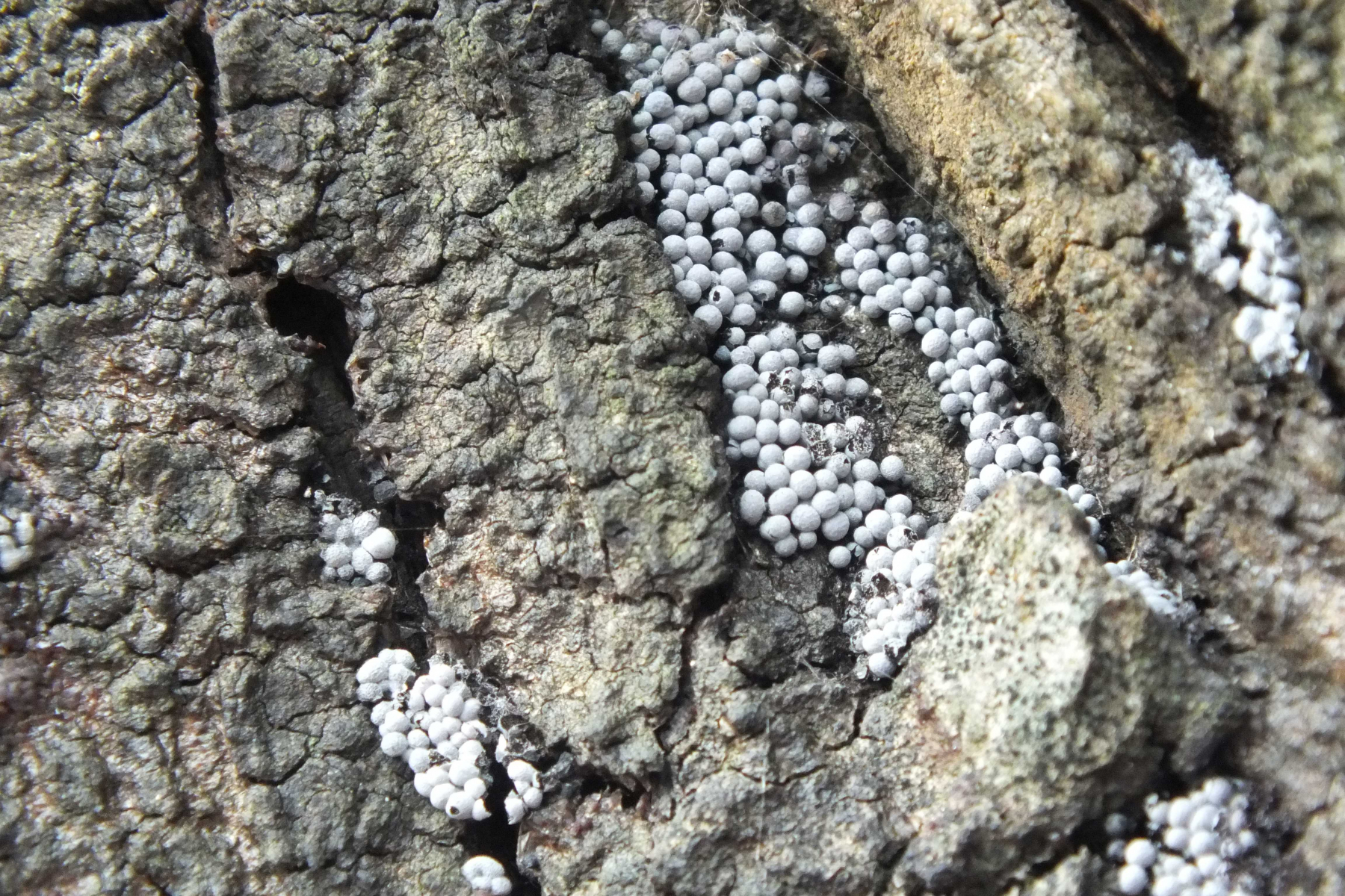 Da ich bisher kein Detailwissen über Schleimpilze habe, frage ich mich, ob dieser Überzug vielleicht mit der Anwesenheit des Schleimpilzes am Stamm zusammenhängt.