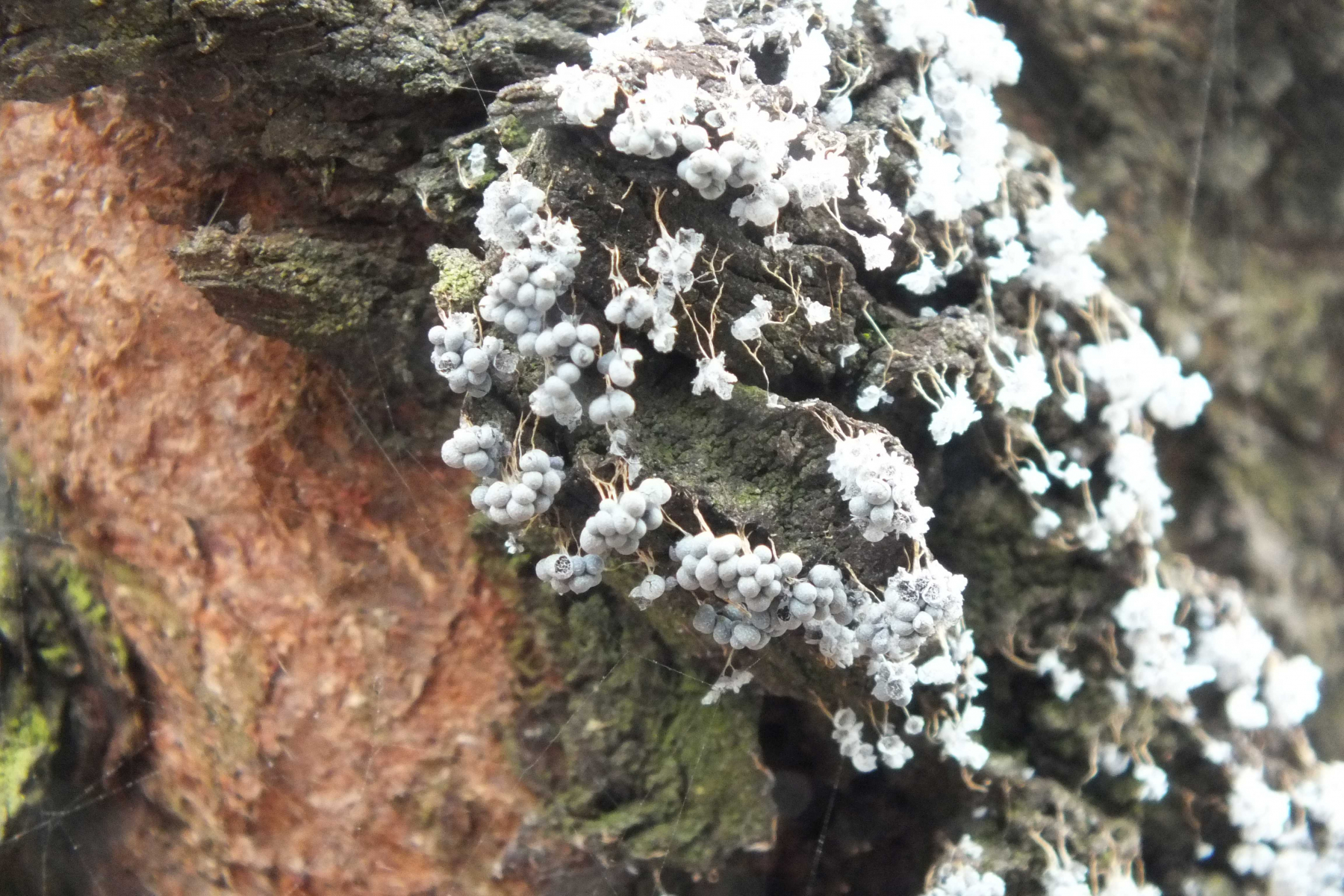 Die jungen Fruchtkörper eines Baumpilzes waren zum Teil mit Gespinnsten überzogen, welche mir gar nicht als Teil des Fruchtkörpers erscheinen wollen.