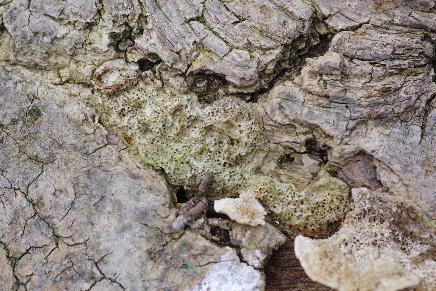 3) Die Haseln werden hier nicht alt und sind damit im Prinzip pilzfrei, löbliche Ausnahme am Rande des Walds, Meroliopsis corium