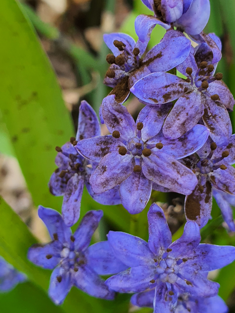 Es ist der Blaustern-Antherenbrand (Antherospora scillae), den ich dort schon seit vielen Jahren zuverlässig finde. Er ist ziemlich infektiös, man tut sich hier sehr schwer, einen gesunden Blaustern zu finden.