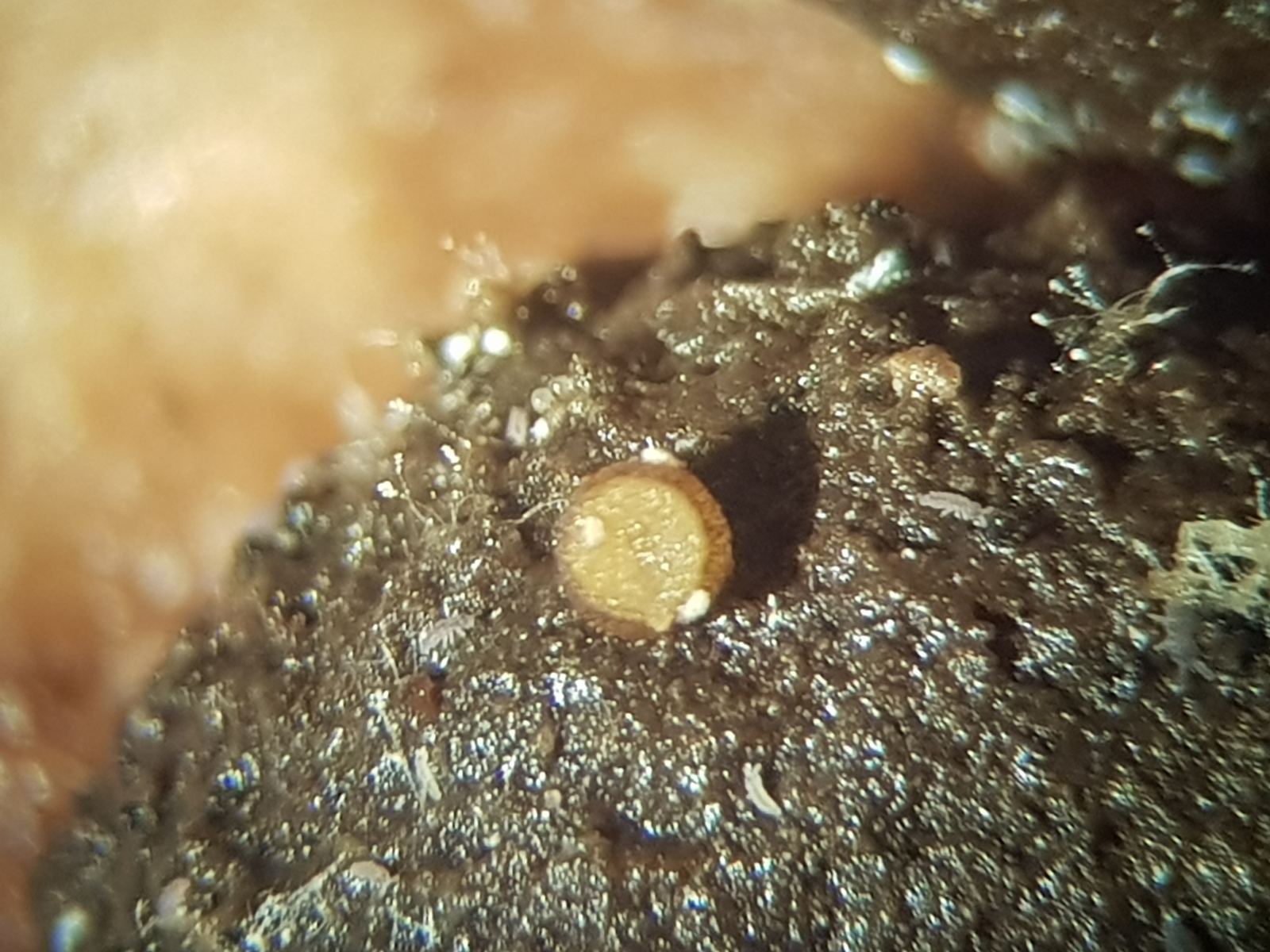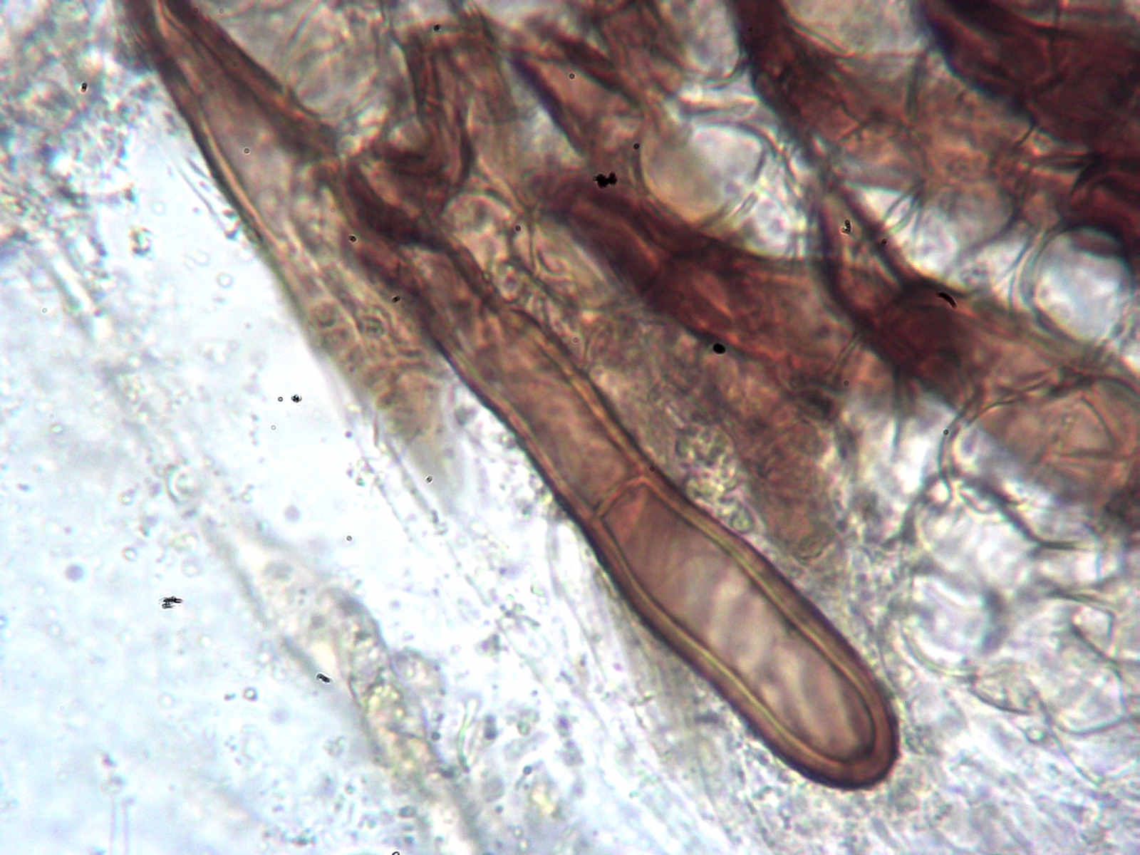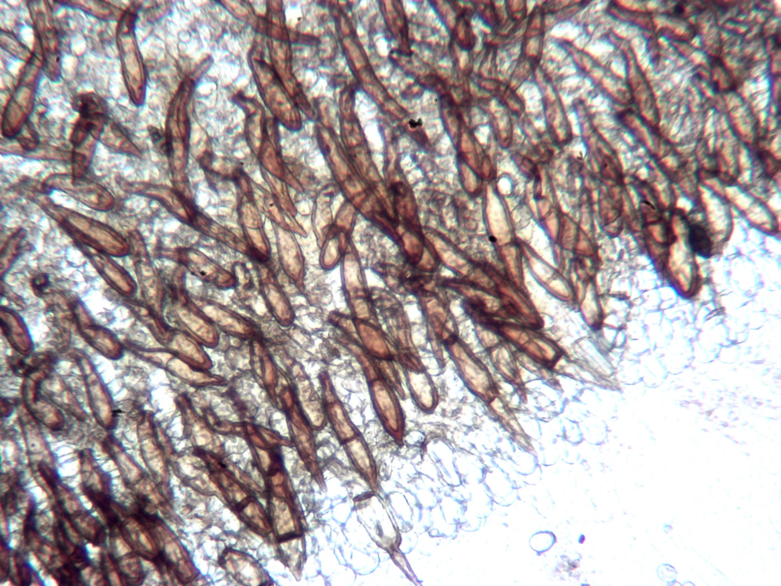 Auf der Außenseite sind braune Pünktchen erkennbar, die sich im Mikroskop als kurze dickwandige Haare herausstellten. Diese sind ca. 100 µm lang (die randständigen auch etwas länger) und un-, ein- oder zweifach septiert. Die Haare an der Außenseite sind abgerundet braun, die randständigen zugespitzt, wobei die Spitzenzelle heller ist.