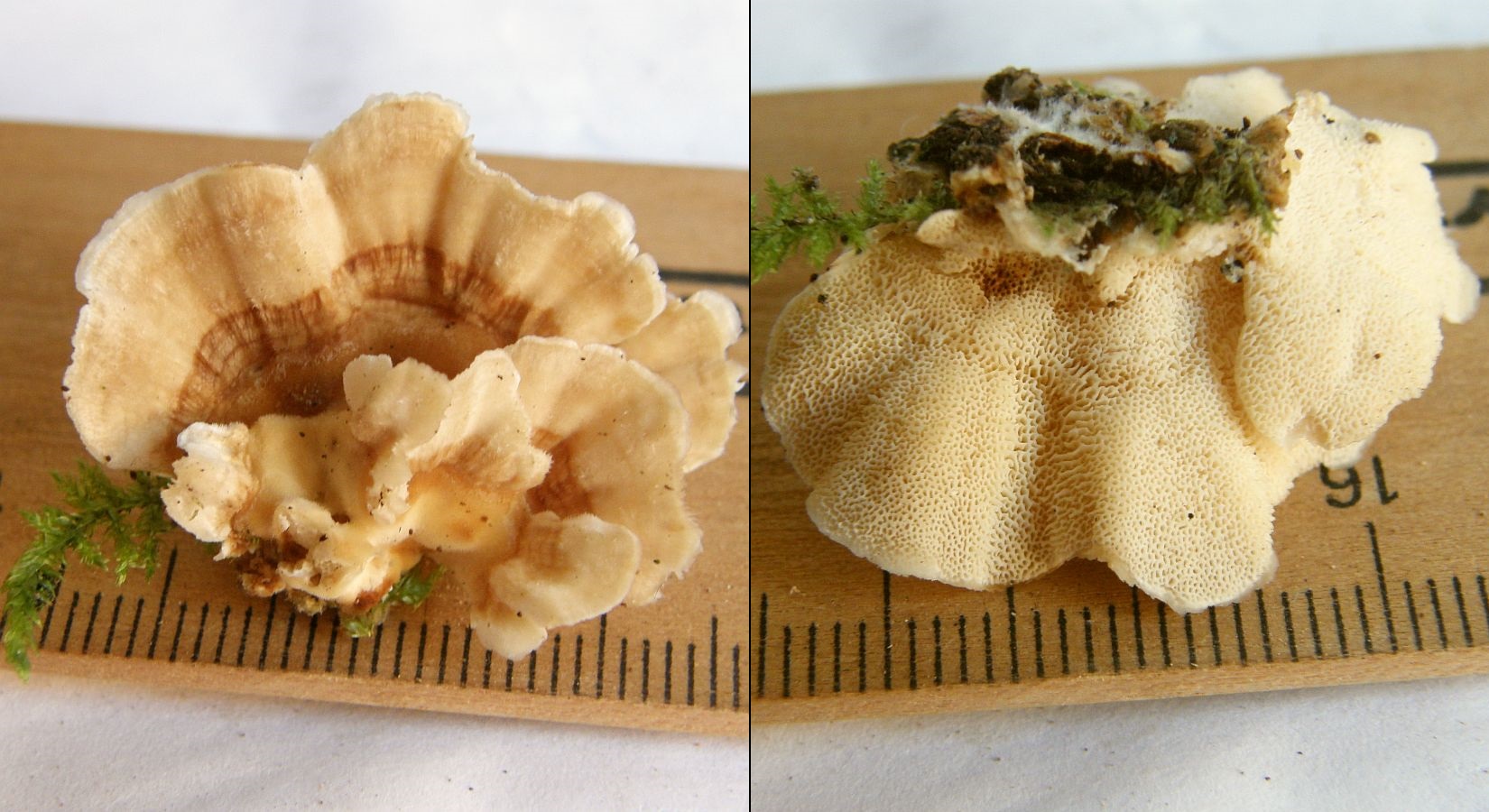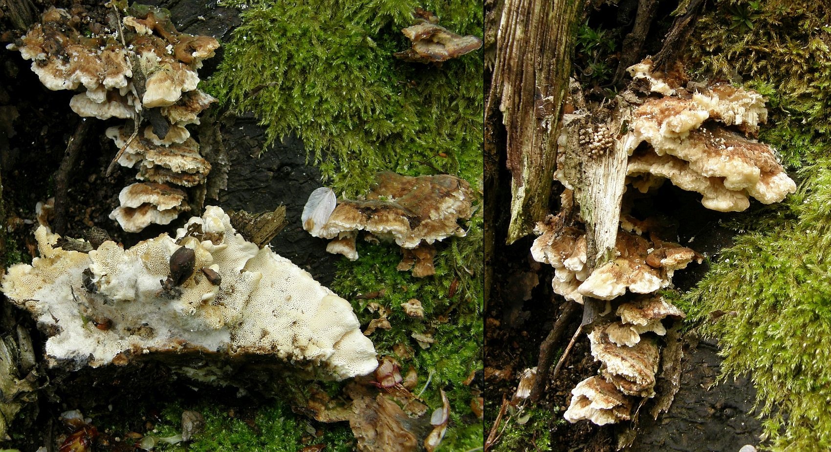 Es gibt auch von Trametes versicolor (Schmetterlingstramete) solche ockerfarbigen Formen, farblich ist die eben extrem variabel, aber von der Wuchsform und Struktur der Hutoberseiten passt doch versicolor meiner Meinung nach viel besser als ochracea.