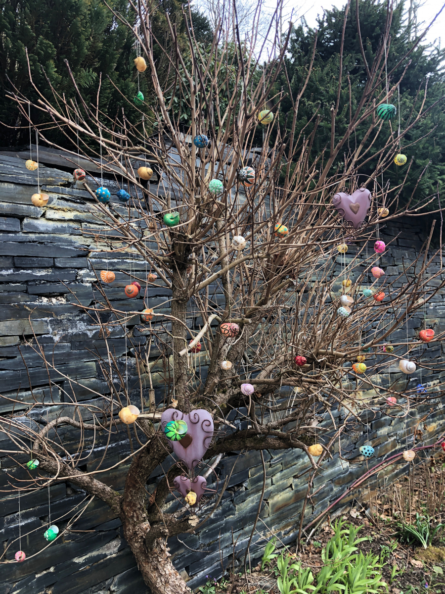 Und noch ein Tipp für die künftigen Schneckenbemalerinnen. Wenn die draußen hängen sollen, muss das Bändchen wirklich sorgfältig eingeklebt werden. Dazu ist wichtig, dass die Schnecke zuvor völlig von Restschleim und Innenhäutchen befreit wird. Mir sind 6 Schnecken von der Aufhängung gerissen, die ich nun neu verkleben muss. Ausgepustete Eier hätten die Osterstürme allerdings gar nicht überlebt.