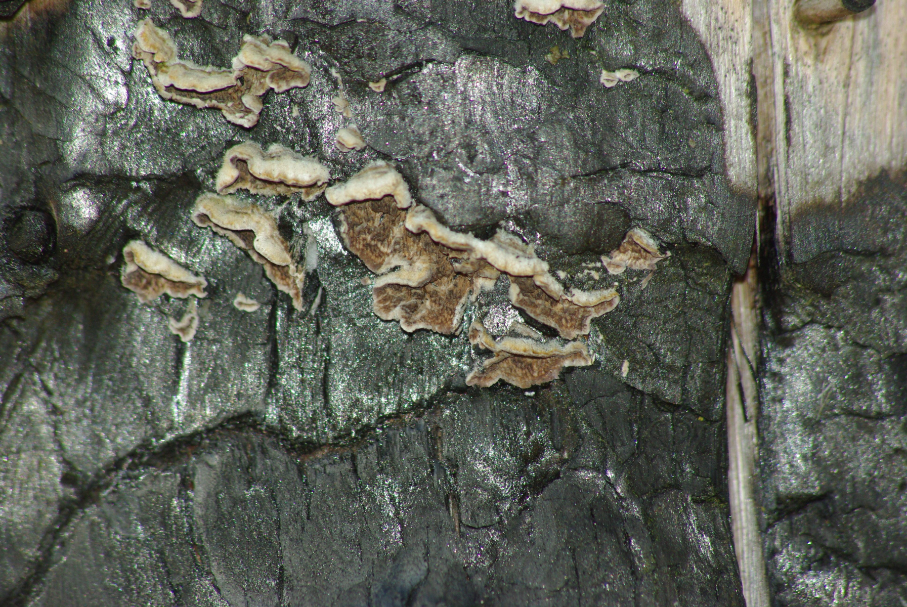 bei diesem Pilz habe ich immer noch keine Idee. Das Bild stammt von 2010. Das Substrat müsste Kiefer sein, falls das bei Kohle überhaupt noch relevant ist, andererseits scheint da auch ein Pilz an der unverbrannten Stelle zu sein - rechts oben, falls das nicht was anderes ist.