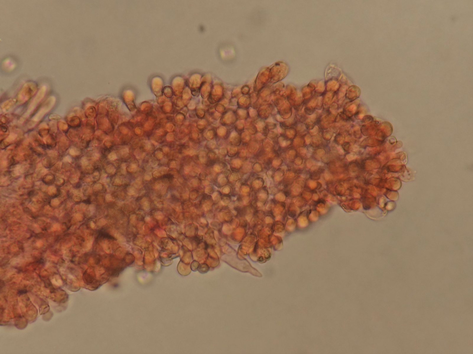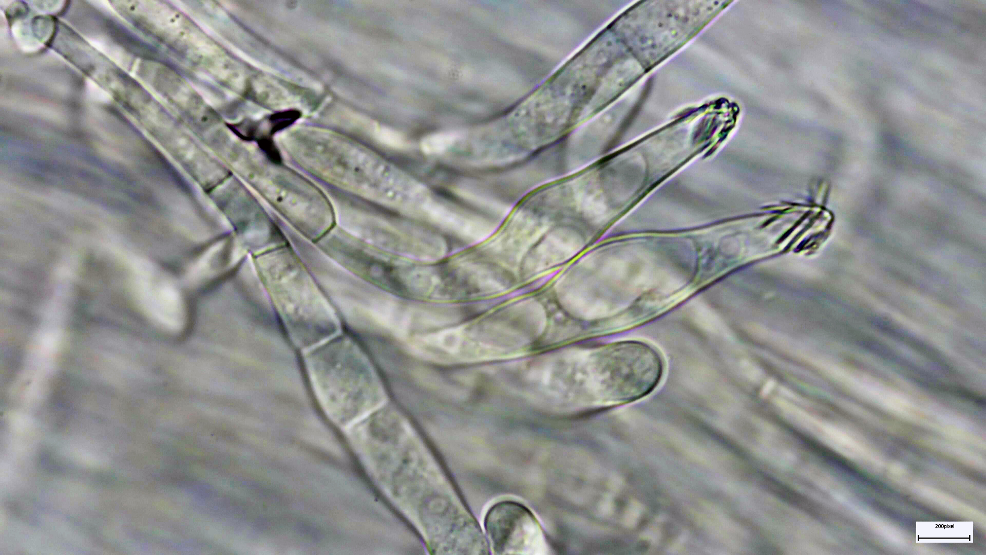 Hymenialzystiden ca. 55µm Länge, unseptiert, dünnwandig (0,2µm), dickbauchig (bis 18µm), deutlich beschopft.