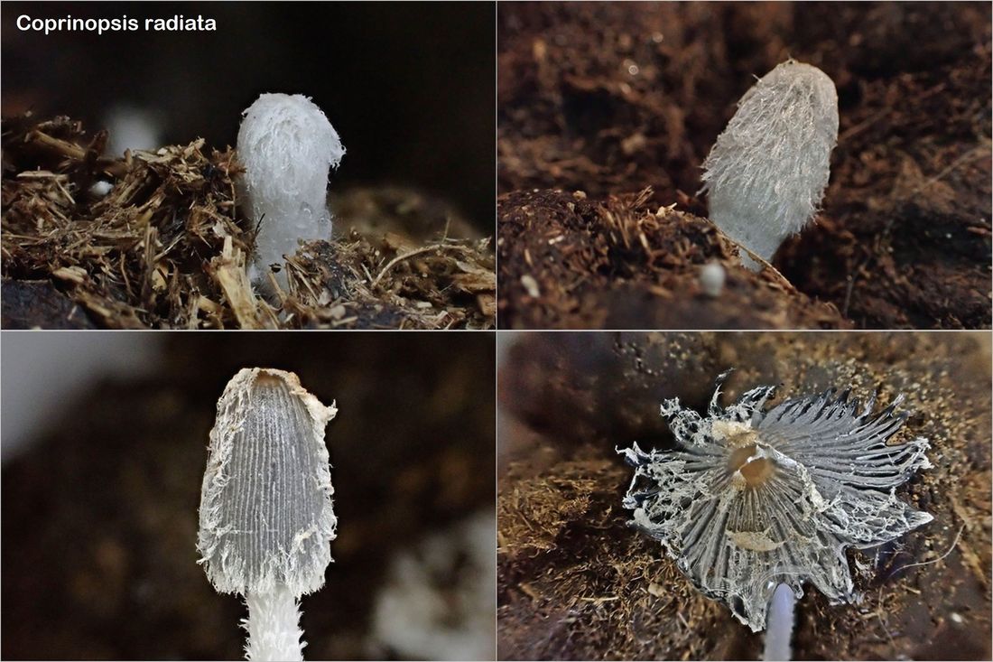 Dieser hübsche Tintling gehört wegen seiner Velumstruktur (Ketten länglicher Elemente) zur Sektion Lanatuli. Aufgrund der großen Sporen (hier 12-15 x 7-8,5 µm) ist er recht einfach zu bestimmen. Ich konnte ihn während verschiedener Entwicklungsphasen einfangen, wie die Collage zeigt. Der Durchmesser des aufgeschirmten Hutes betrug 1,5 cm.