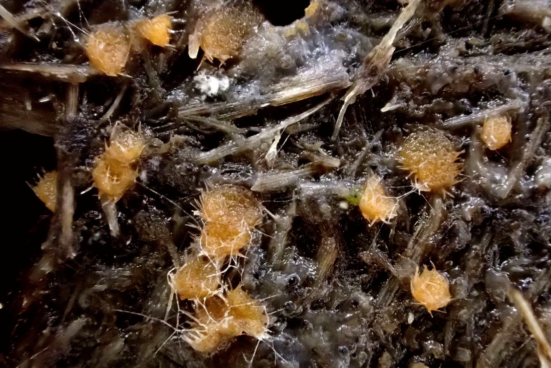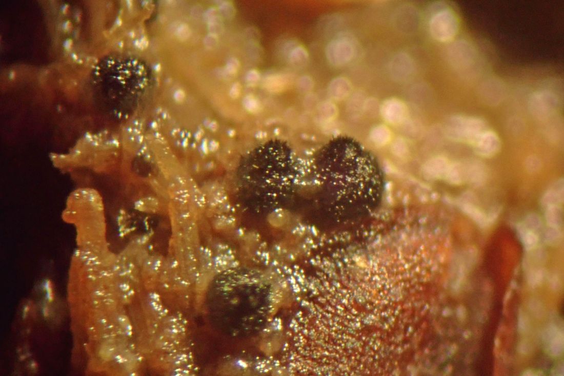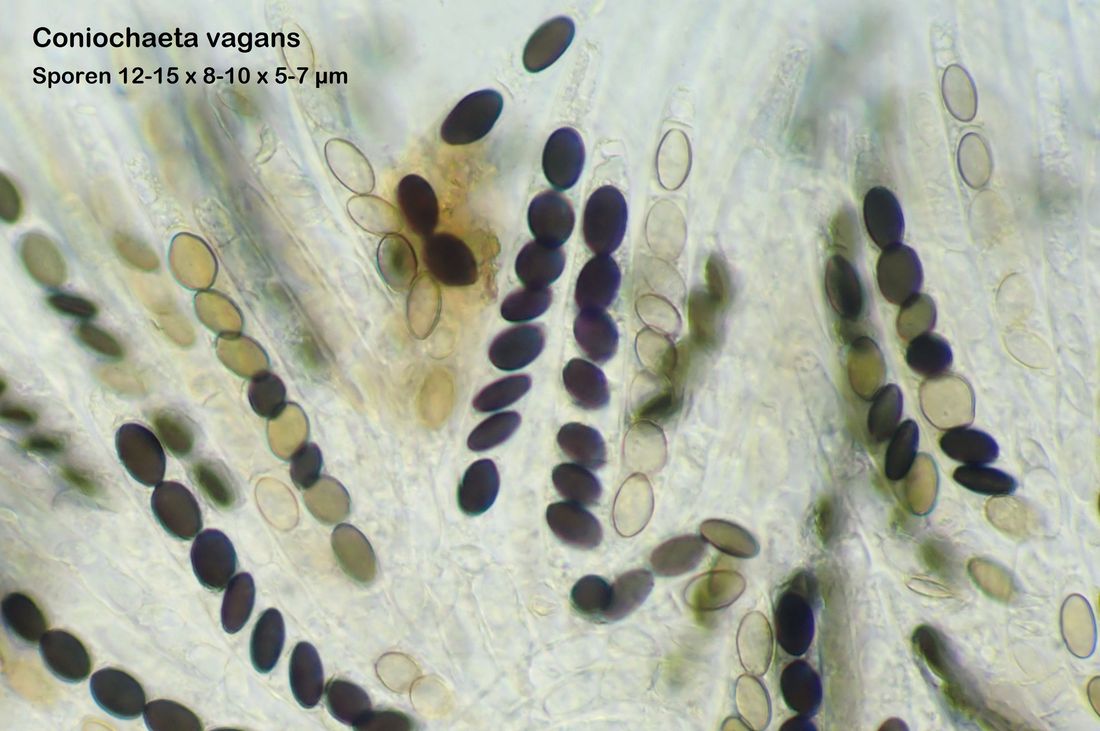 Die Arten der Gattung stellen sich in der Regel erst ein, wenn bereits andere Arten verschwunden sind. So auch Coniochaeta vagans. Die winzigen Pilze (< 0,5 mm) sind vor allem im oberen Bereich dicht behaart. Dass das eine sehr wehrhafte Abwehr gegenüber Fressfeinden ist, kann man sehr schön auf folgendem Bild erkennen.
