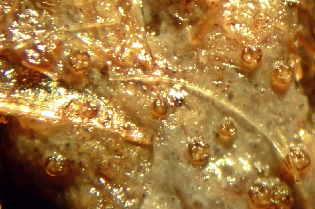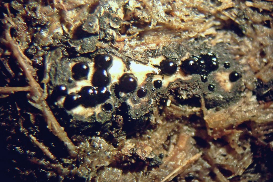 Funde von Arten der Gattung Hypocopra sind immer etwas besonderes, auch wenn diese meist alles andere als einfach zu bestimmen sind. Kennzeichnend für die Gattung ist ein Stroma, in dem ein oder seltener auch mehrere Perithecien sitzen. Im folgendem Schnittbild sehen wir ca. 20 Fruchtkörper, deren Sporenmassen nach dem Schnitt aus einem einzigen Stroma quellen. Die Größe des Stromas betrug hier übrigens 8 x 3 mm.