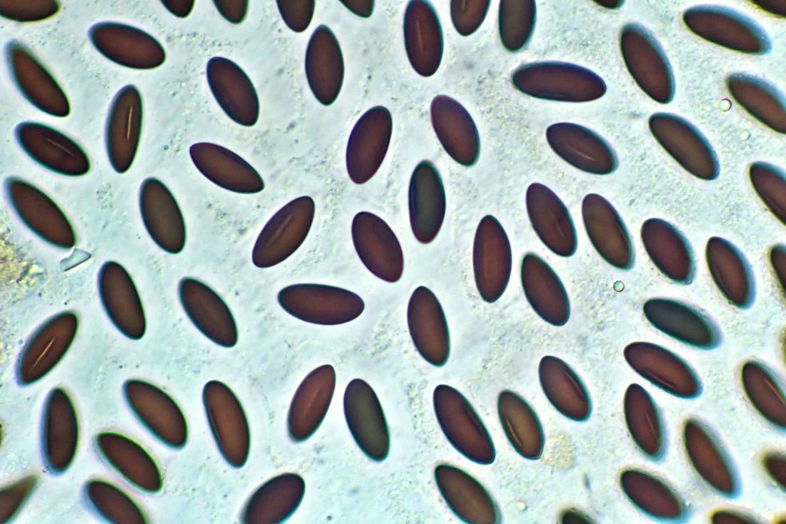 Mit einer Sporengröße von 22-26 x 11-13 µm und einer relativ kurzen Keimspalte von 12-14 µm sollte das Hypocopra brefeldii sein, auch wenn die Art als zweizellig beschrieben wird. Diese zweite winzige und hyaline Basalzelle konnte ich nicht entdecken und bin da in guter Gesellschaft mit u.a. Francesco Doveri, dem "Dungpilzpapst" der letzten Jahre, welcher sie auch nicht fand. Ebenfalls Stromata mit mehreren Perithecien können u.a. Hypocopra cataphracta und planispora bilden, die jedoch deutlich verschiedene Sporen haben.