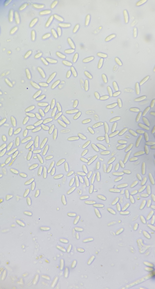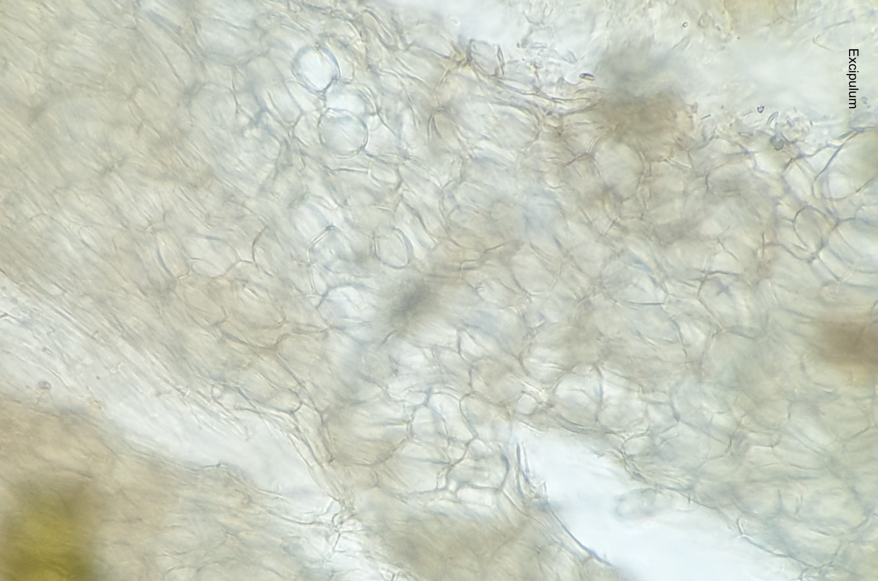 Ich dachte an Hymenoscyphus imberbis, aber es verfärbt sich nichts blau, weder Porus noch Excipulum. Auch die Sporenmaße passen nicht ganz.