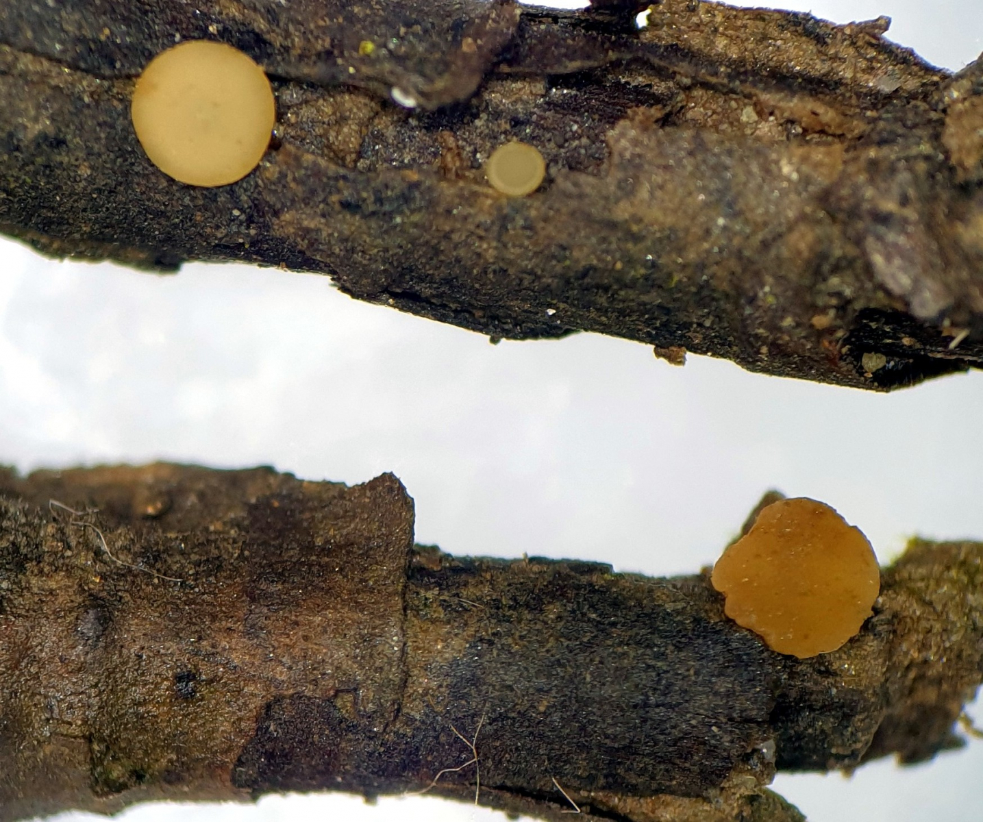 auf meiner letzten Gassirunde am Bächlein fand ich auf einem halbvergrabenen (vermutlich Eschen-) Ast, diese kleinen Becherchen.