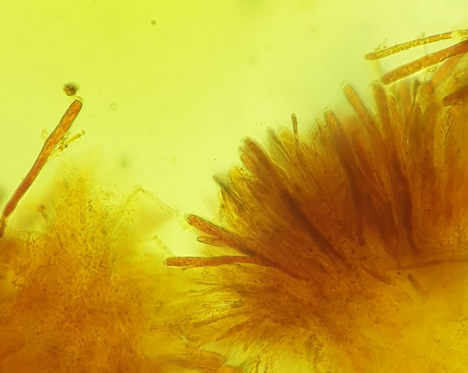 Ich dachte an Hymenoscyphus imberbis, aber es verfärbt sich nichts blau, weder Porus noch Excipulum. Auch die Sporenmaße passen nicht ganz.