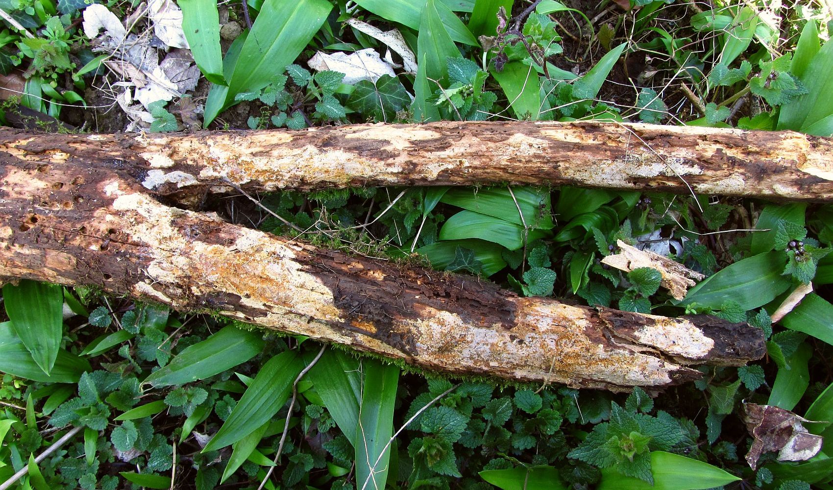 unterseits an einem dicken, liegenden Laubholzast zwischen Bärlauch und Morchelbecherlingen