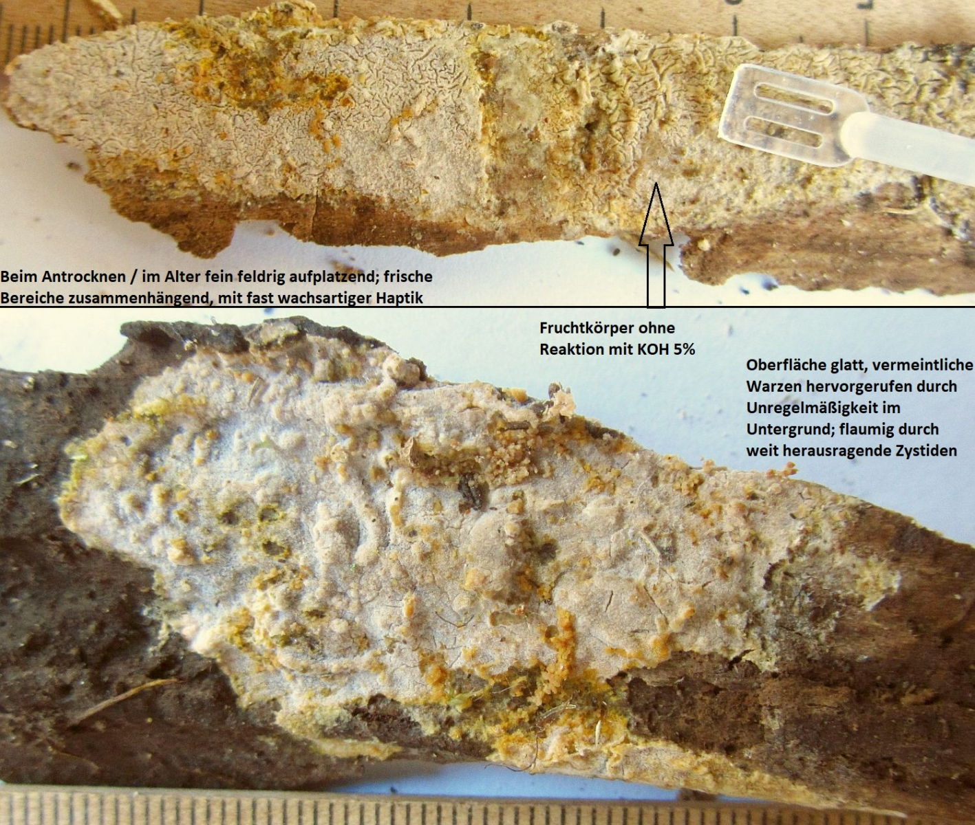 Vom Substrat nicht ablösbar, ohne erkennbares Subikulum, keine Rhizomorphen, von den herausragenden Zystiden flaumig behaart, glatt, frische Bereiche in der Haptik fast wachsartig, ältere Bereiche rissig und eher krustenartig; glatt, keine Zähnchen