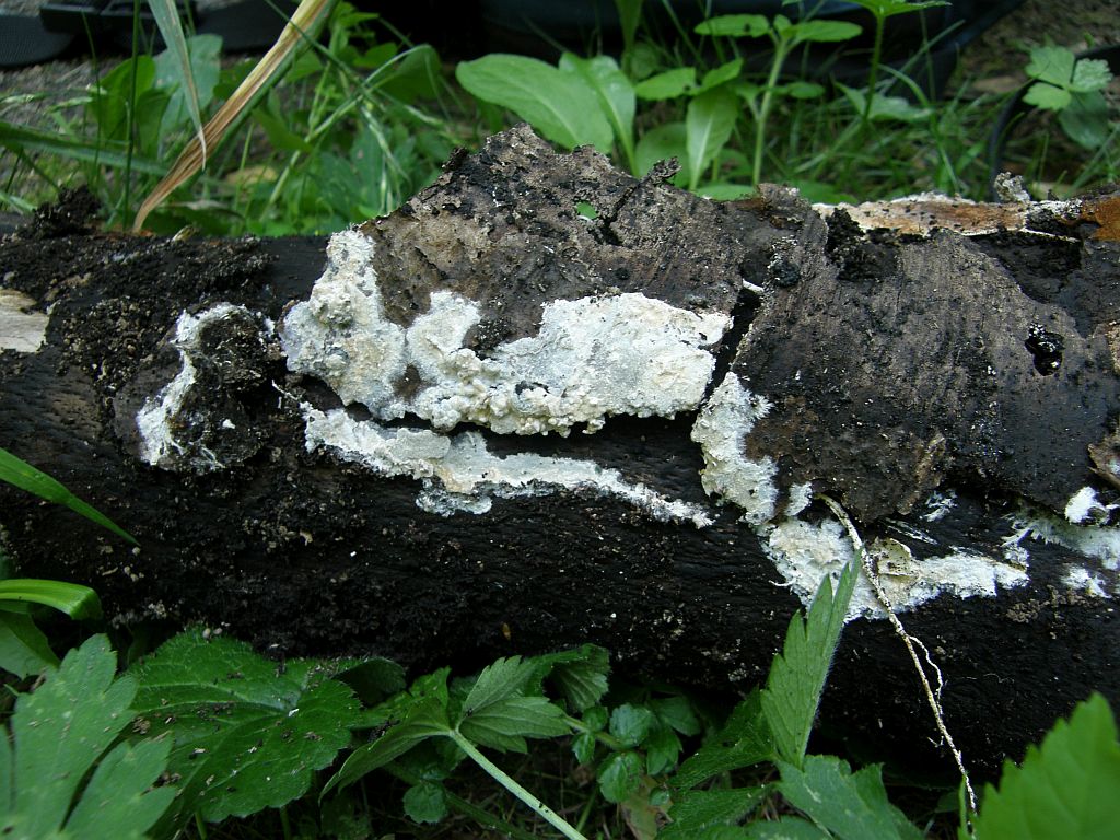 Ich bin mir ziemlich sicher, da auf Phlebiopsis roumeguerei bzw. Phlebiopsis ravenelii gestoßen zu sein. Phlebiopsis gigantea sieht ja vor allem makroskopisch ganz anders aus, dürfte kaum jemals an Laubholz vorkommen und hat größere Sporen (Achtung beim vergleich in FE12: Sporengrößen im Schlüssel von Phlebiopsis gigantea und Phlebiopsis roumeguerei sind vertauscht, im Text dann wieder korrekt).