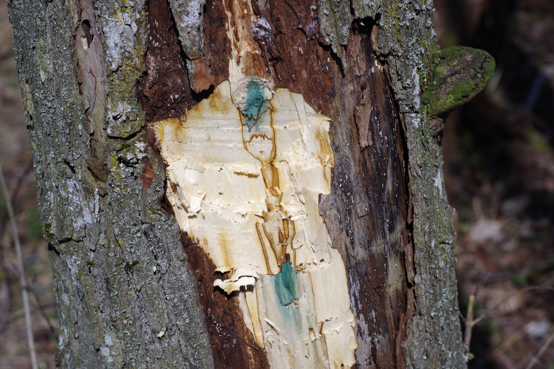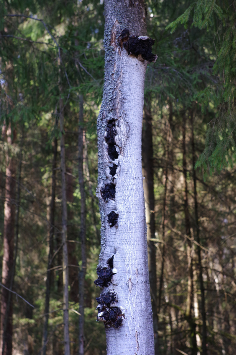 18) Anderer Standort, trockener Nadelwald. Eine surrealistische Birke mit vielen Čagas, die aussieht, als wäre sie gestrichen. Sporenpulver? Ein Frk. war aber nicht zu sehen.