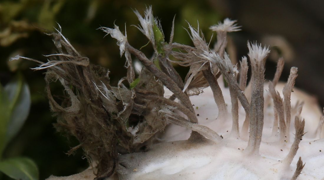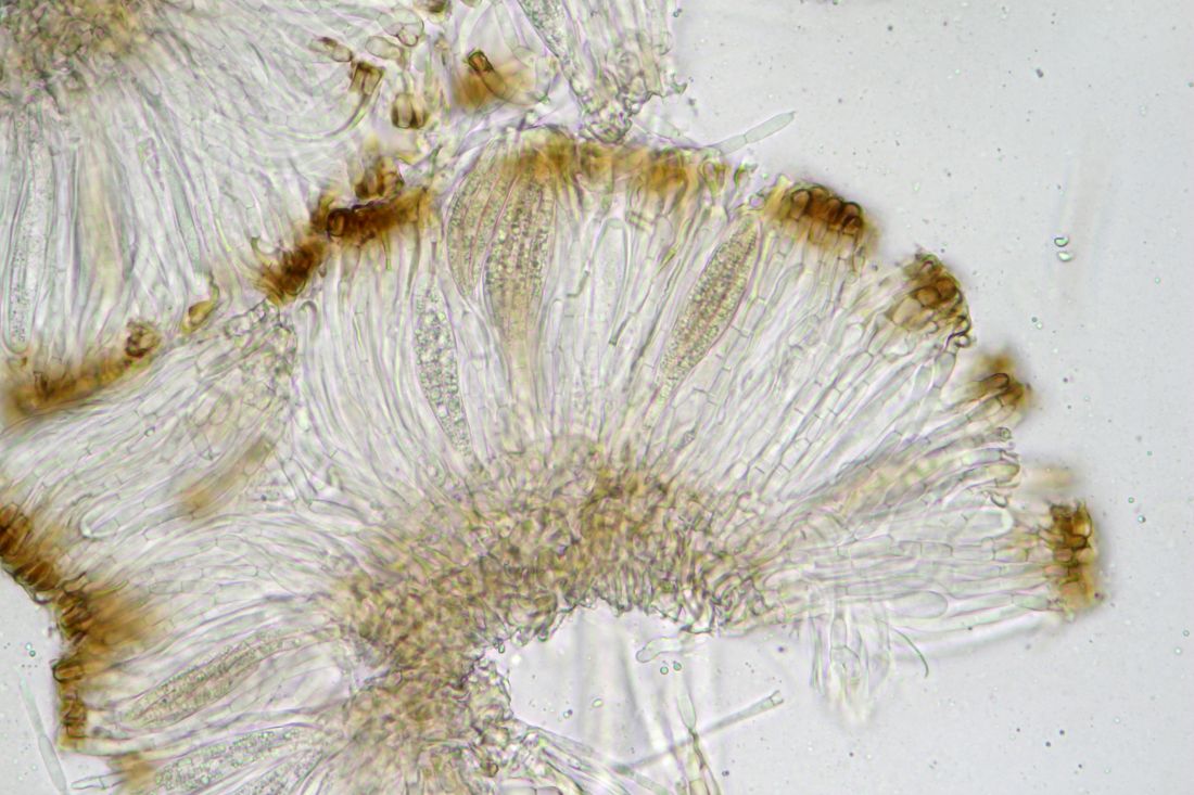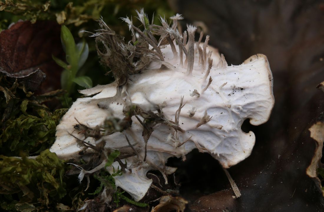 Die Unterseite ist weiß, bis zur Mitte hab ich die allerdings nicht entnommen. Beim Trocknen wird der hintere Bereich der Unterseite deutlich dunkel. Rhizinen besonders im apikalen Bereich aufgefächert, nach unten eher glatt (siehe Bilder).
