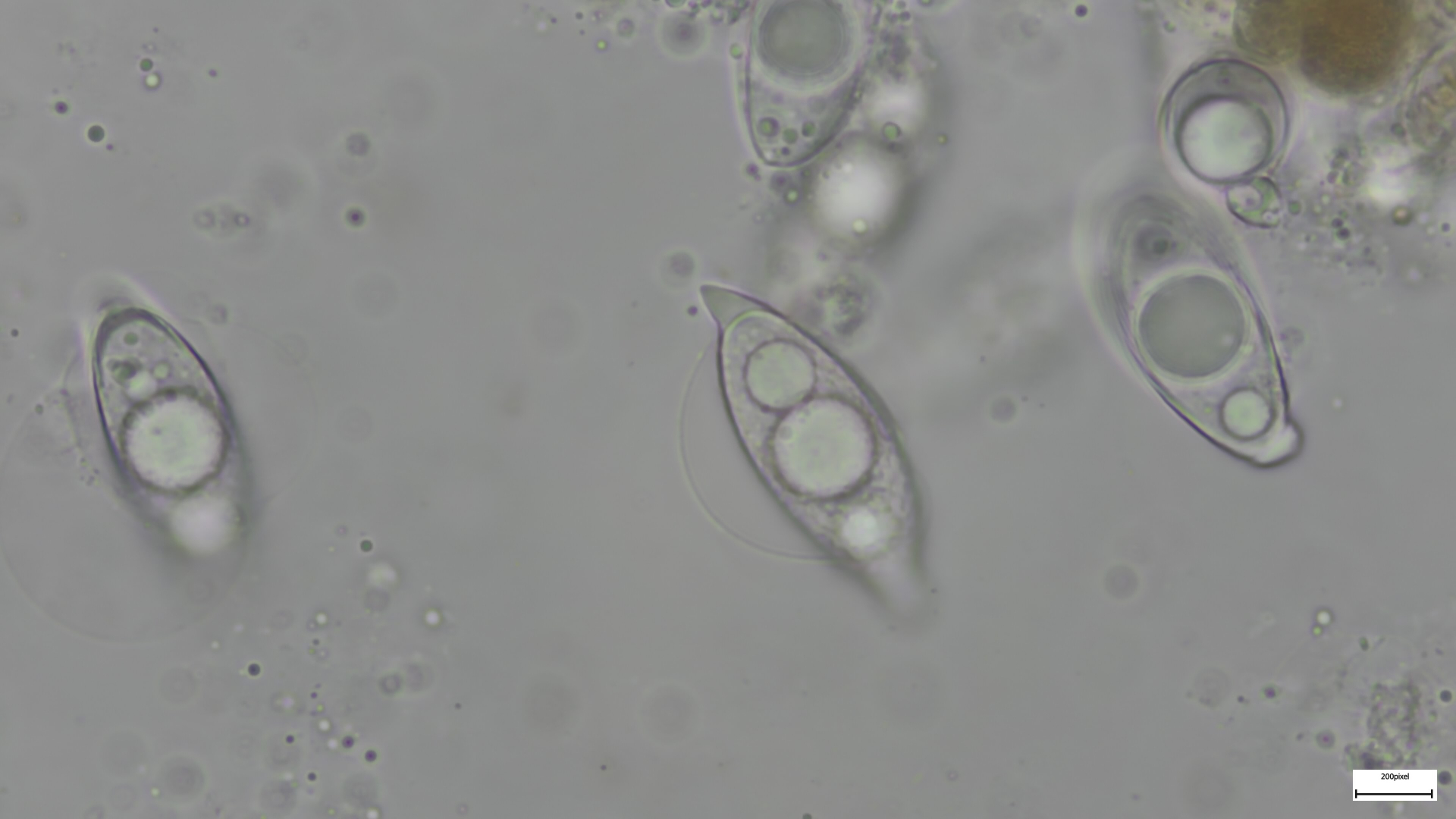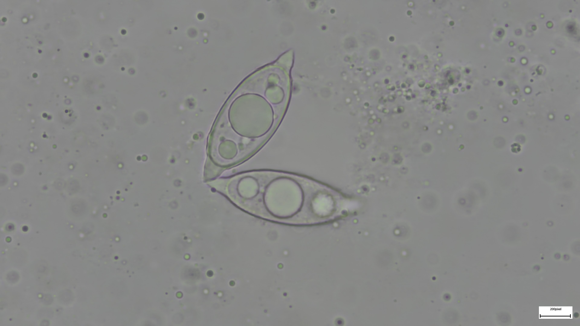 Die Anhängsel ließen sich hier problemlos darstellen. Interessant war noch etwas anderes. Nicht wenige Sporen hatten eine Art Hülle. Das habe ich so noch nicht bewusst wahrgenommen sonst. Hat jemand eine Idee zu diesem Phänomen und kann mich aufklären.