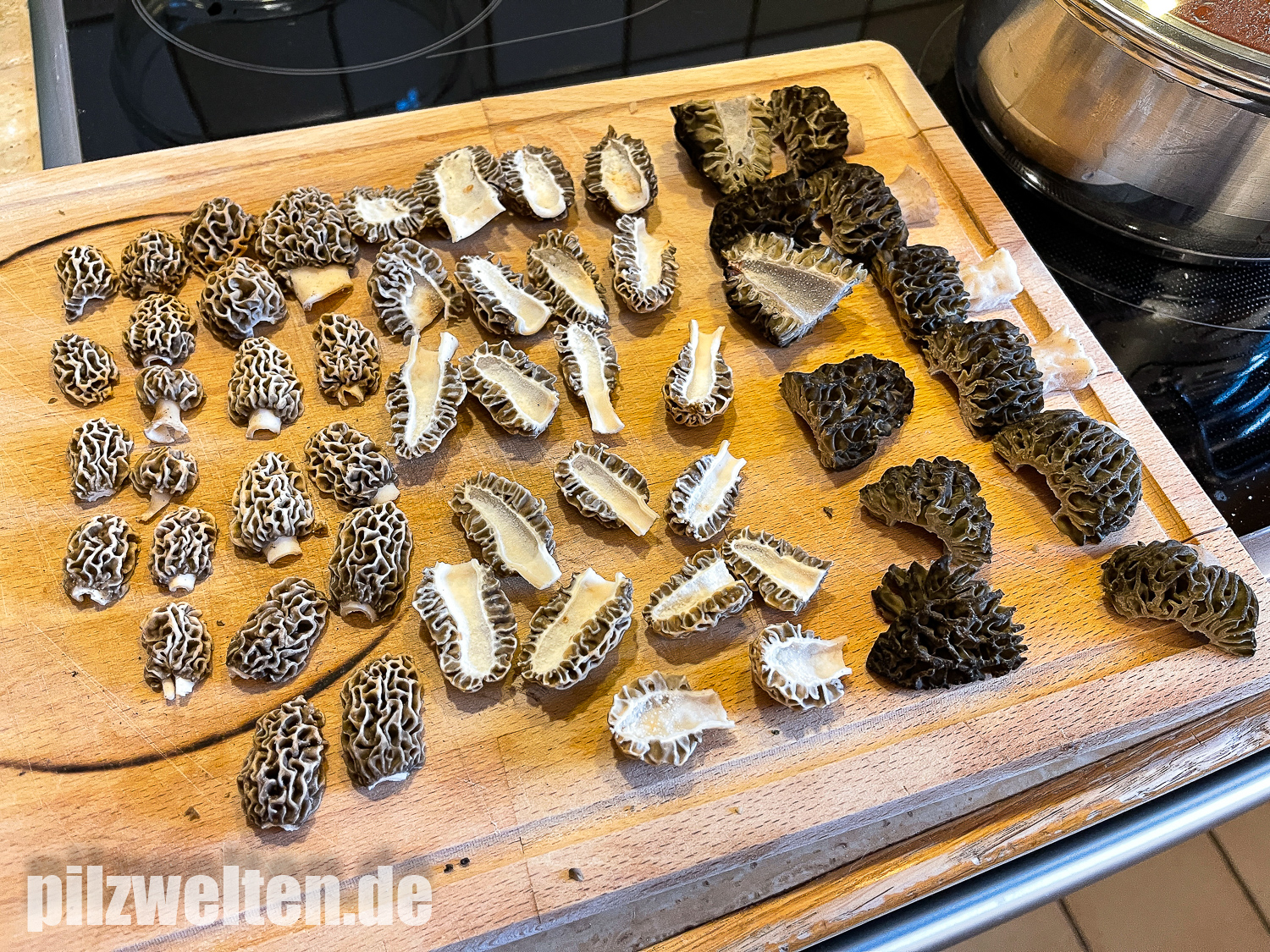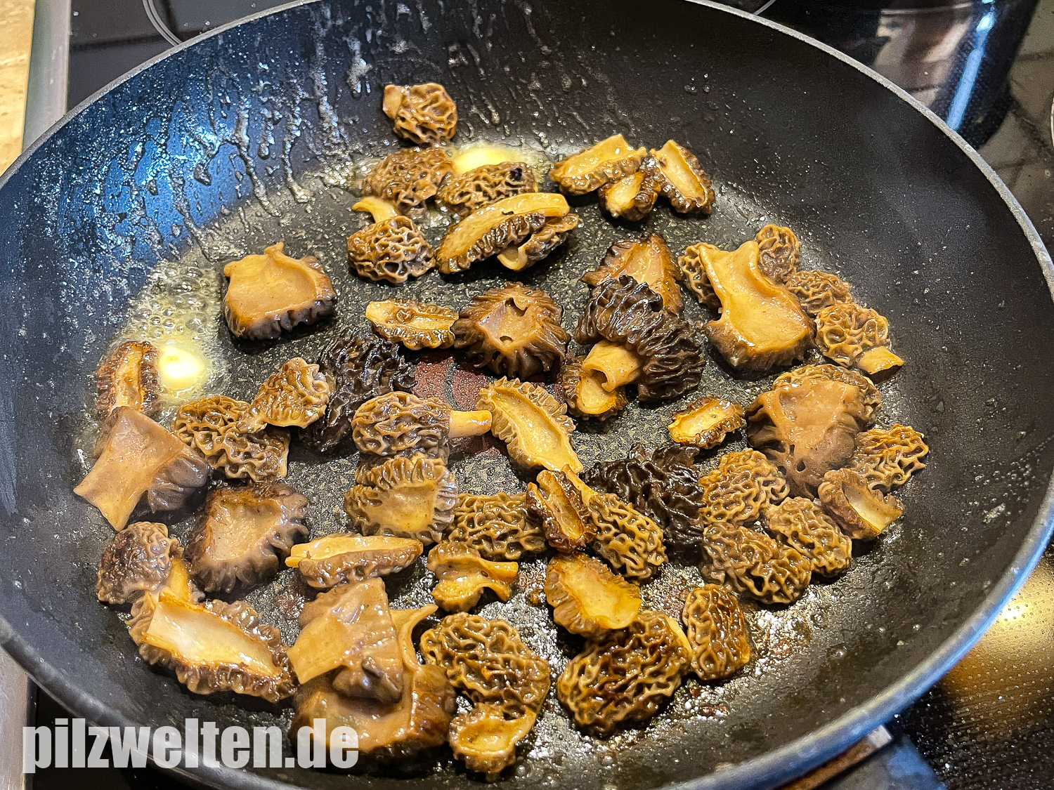 Da Spitz- und Speisemorcheln immer hohl sind, sollte man auch kleinere Morcheln immer halbieren, da sich im inneren der Morchel häufig Insekten oder auch Schnecken verstecken. Die so halbierten bzw. in mundgerechte Stücke zerteilten & sauberen Morcheln braten wir vorsichtshalber immer erst mit etwas Butter an. Morcheln sind (wie die meisten Wildpilze) roh giftig. Durch das vorherige Anbraten stellen wir sicher, dass wirklich alle Morcheln, die wenig später auf der Pizza landen, wirklich durchgegart sind, bevor sie verzehrt werden. Außerdem würzen wir die Speisemorcheln beim Anbraten meist noch mit etwas grobem Meersalz. Das hebt den Eigengeschmack der Morcheln nochmal etwas heraus.